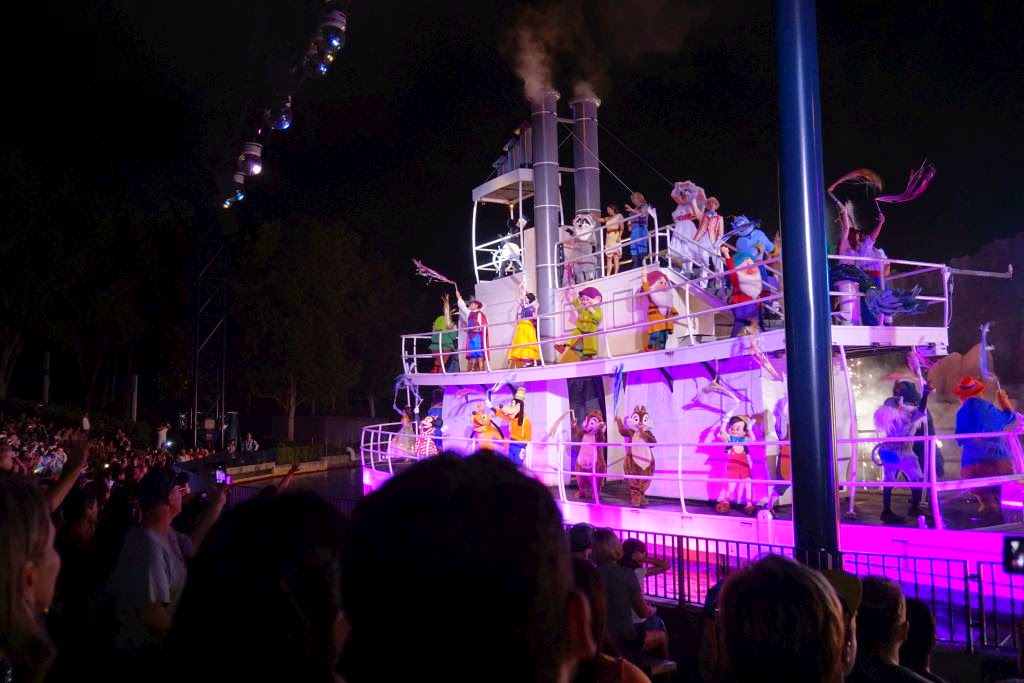 Den großen Höhepunkt sehen wir bei der großen Show „Fantasmic!“, bei der auf Wasserfontänen Videos projeziert werden und die Darsteller auf Booten über den See fahren und auf einem riesigen Felsen tanzen. Mickey muss dabei gegen die Bösewichte kämpfen bevor alle Disney Stars gemeinsam bei einem Feuerwerk feiern können.
