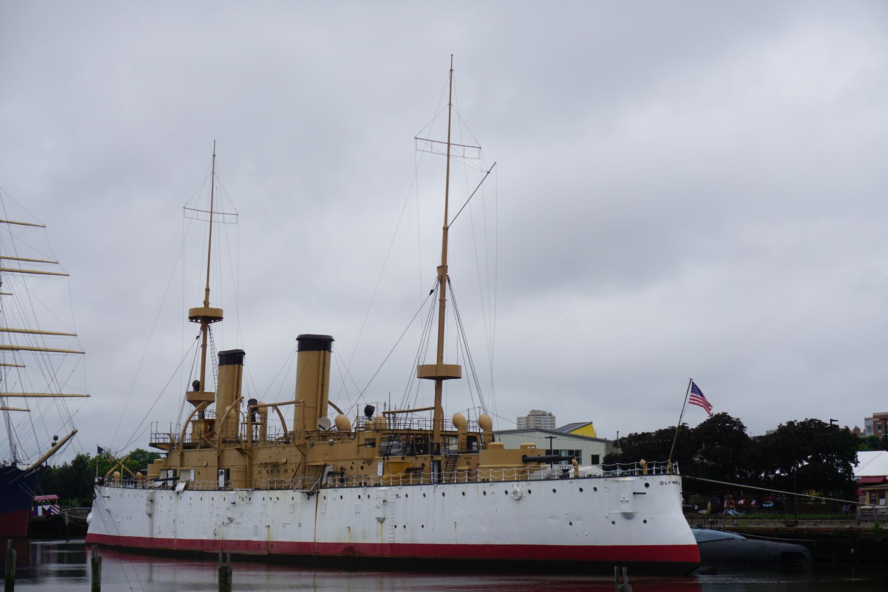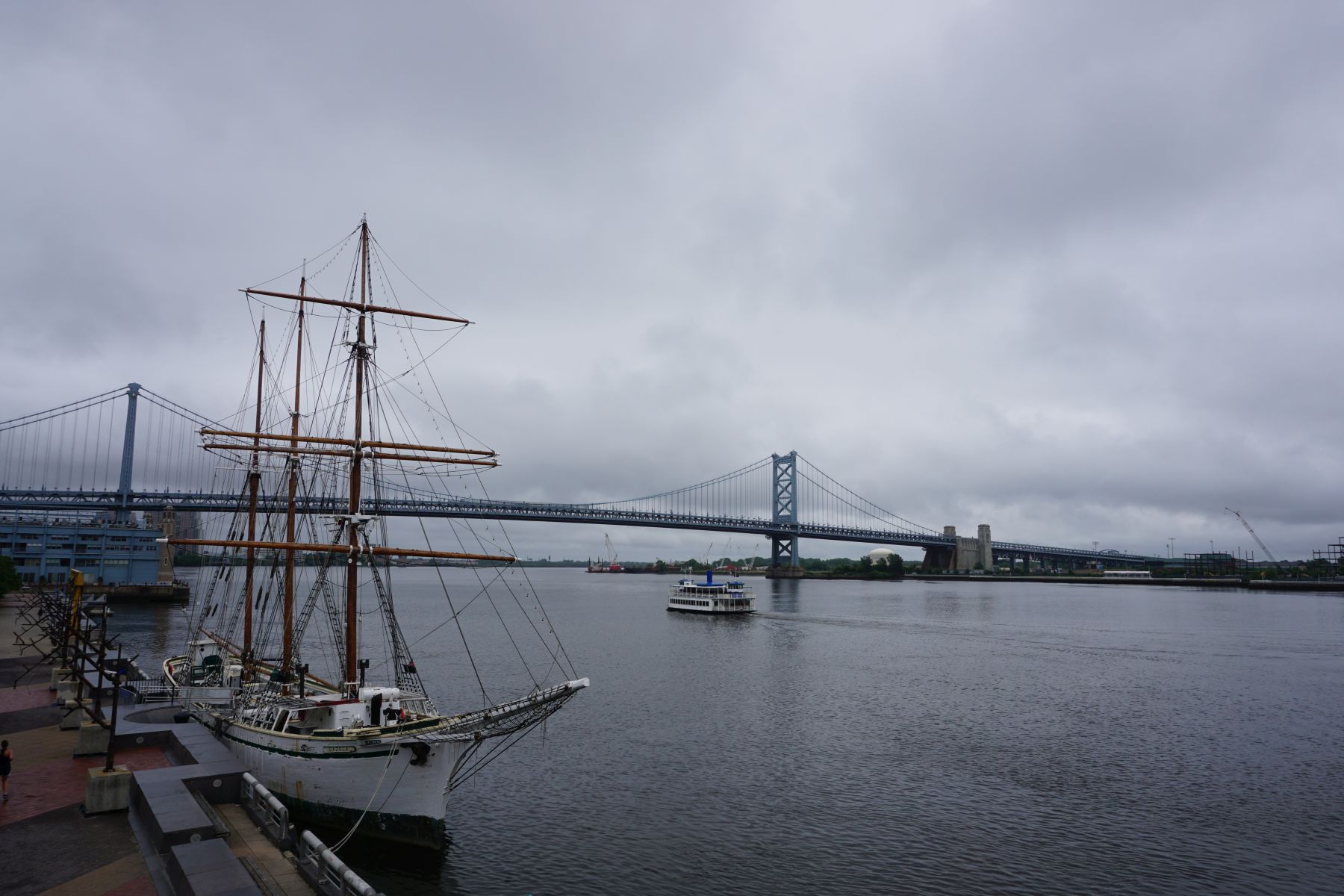 Wir beschließen einen Spaziergang zum Delaware River zu machen und uns Penn’s Landing anzusehen – benannt nach dem Gründer der Stadt Philadelphia. Zu sehen ist wieder die Benjamin Franklin Bridge, über die wir gefahren sind. Aber auch einige Schiffe. Die Segelschiffe Gazela und Moshulu und der Dampfer Olympia, das älteste noch existierende Stahlschiff der US Navy. Am anderen Flussufer ist außerdem das Battleship New Jersey zu sehen.