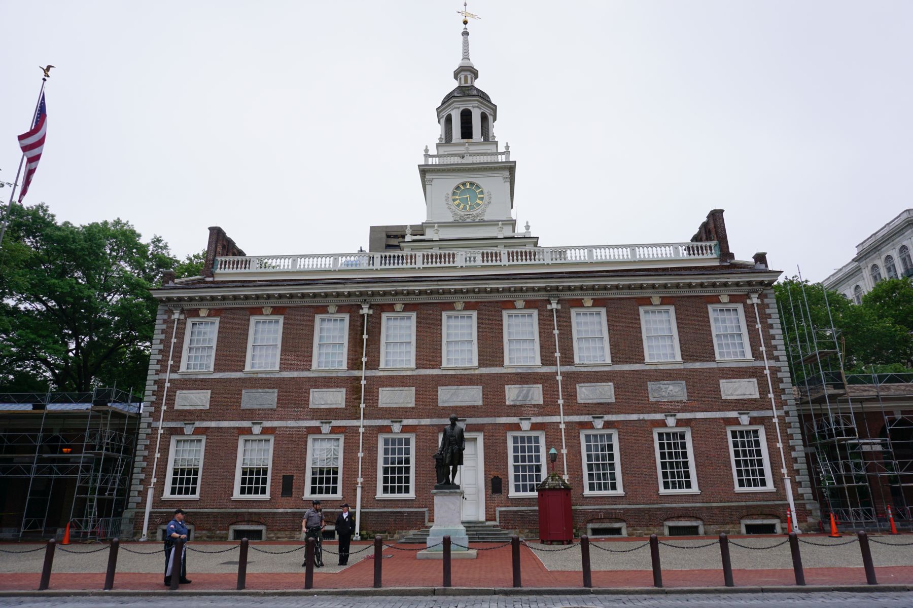 Um 8 Uhr sind wir bereits am Weg zum 1,8 km entfernten Independence Visitor Center. Dort werden um 8:30 Uhr die Tickets für die Führungen in der Independence Hall vergeben. Wir stellen uns also in die Schlange und bekommen Tickets für die 9:15 Uhr Tour. Nach den Sicherheitschecks geht die Führung los. Dieses Gebäude ist das ehemalige Parlamentsgebäude des US-Bundesstaats Pennsylvania, in dem 1776 die Unabhängigkeitserklärung und 1787 die Verfassung der Vereinigten Staaten unterzeichnet wurden. Wir lauschen den Erklärungen unserer „Rangerin“ (oder wie sagt man sonst zu einem weiblichen Ranger?)