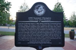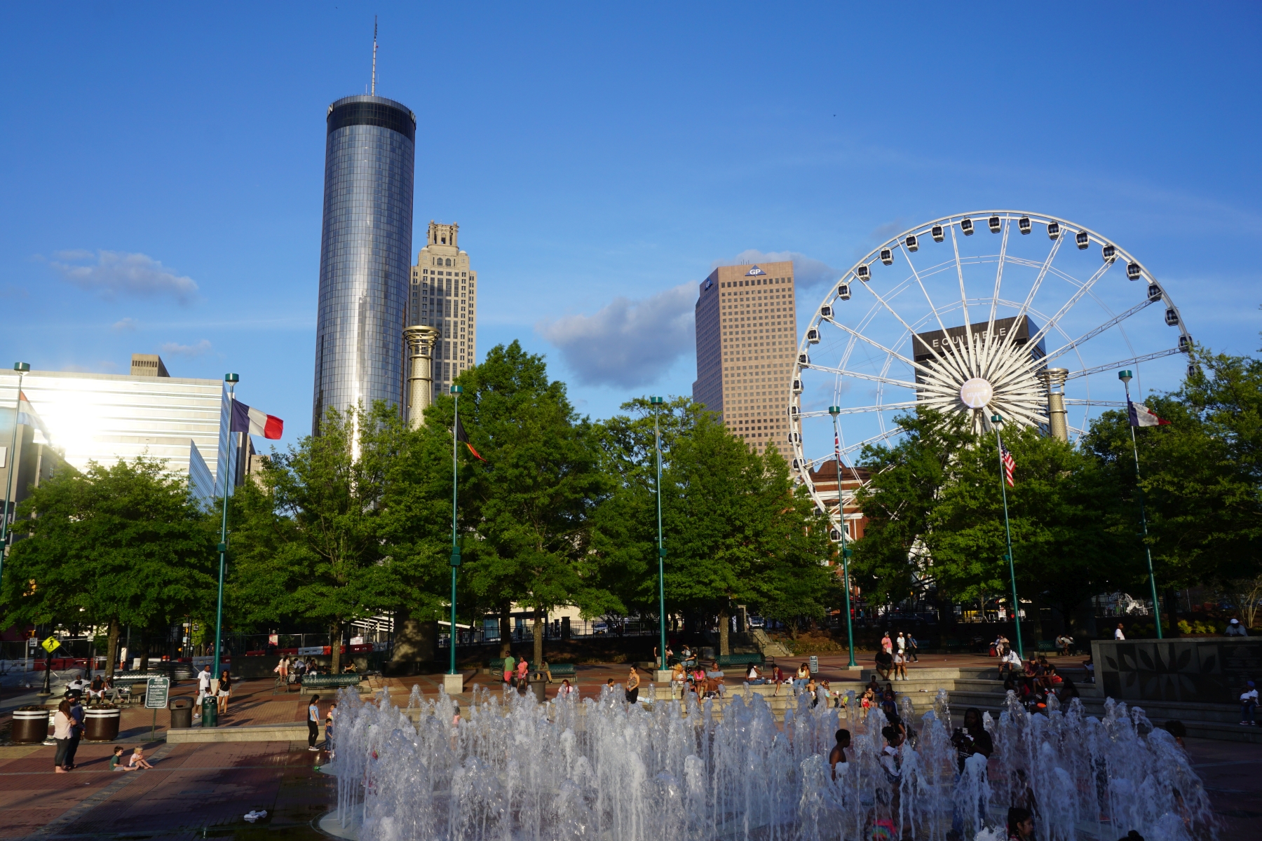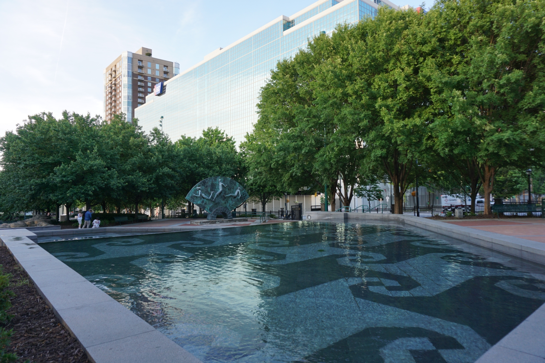 Nach diesem Ausflug in die Hollywood-Welt wandern wir durch den Centennial Olympic Park. Dort dreht sich alles um die Olympischen Sommerspiele 1996. Viele Plätze mit Wasserspielen, Statuen und die vertretenen Sportarten sind in Bodenplatten gegossen. Außerdem schauen wir uns schon mal das Coca-Cola Museum an, das wir morgen besuchen werden.