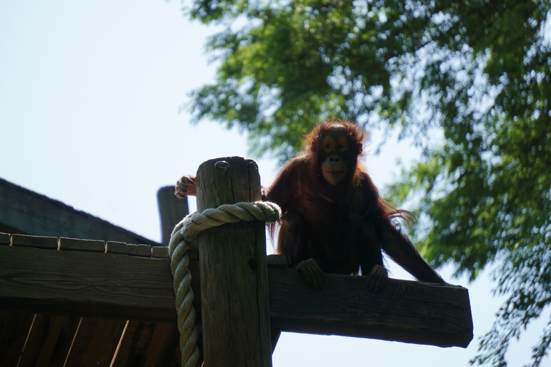 Bei den Orang-Utans geht es sehr gemütlich zu. Auch der jüngste Nachwuchs Pelari turnt auf dem Gerüst herum und genießt die Sonne.