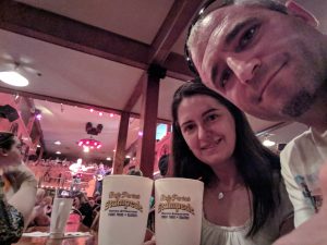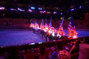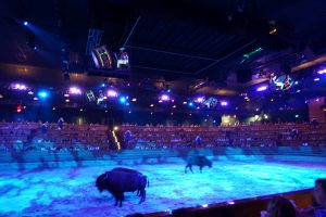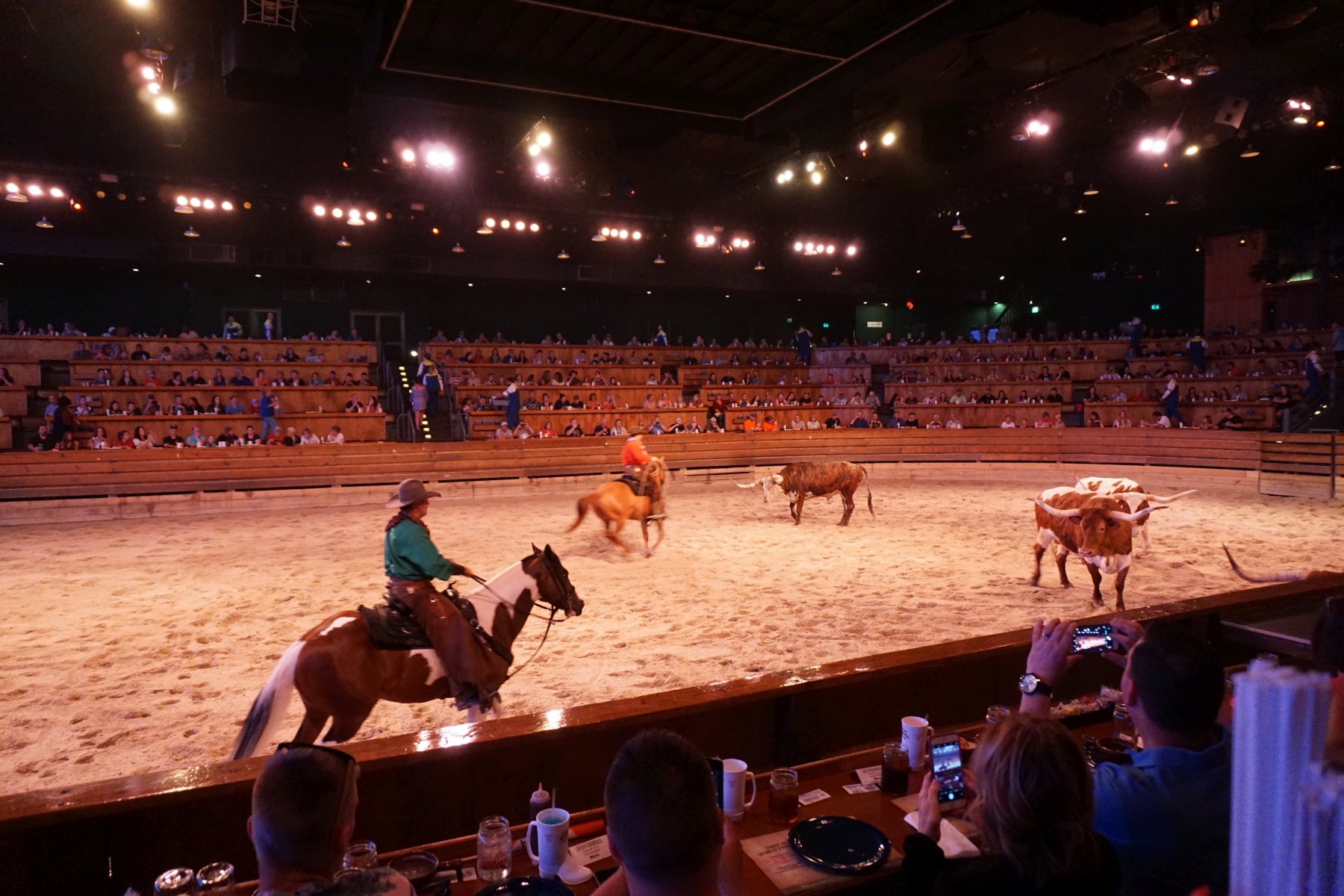 Wir stellen nur unsere Koffer ab, ziehen uns um und müssen gleich wieder los. Heute sind wir in der Dolly Parton’s Stampede Dinnershow. Nach der Ticketabholung werden wir im Saloon von der Bluegrass und Country Band „Mountain Ruckus“ empfangen. Teil der Band ist ein vierfacher Meister im Banjo-Spielen – der ist unglaublich gut! Dazu schlürfen wir Cocktails aus Stiefeln 😉