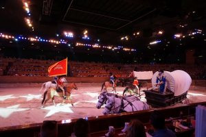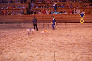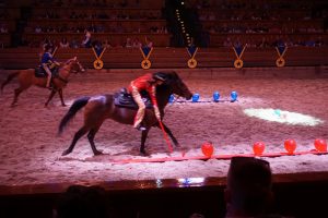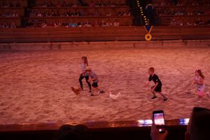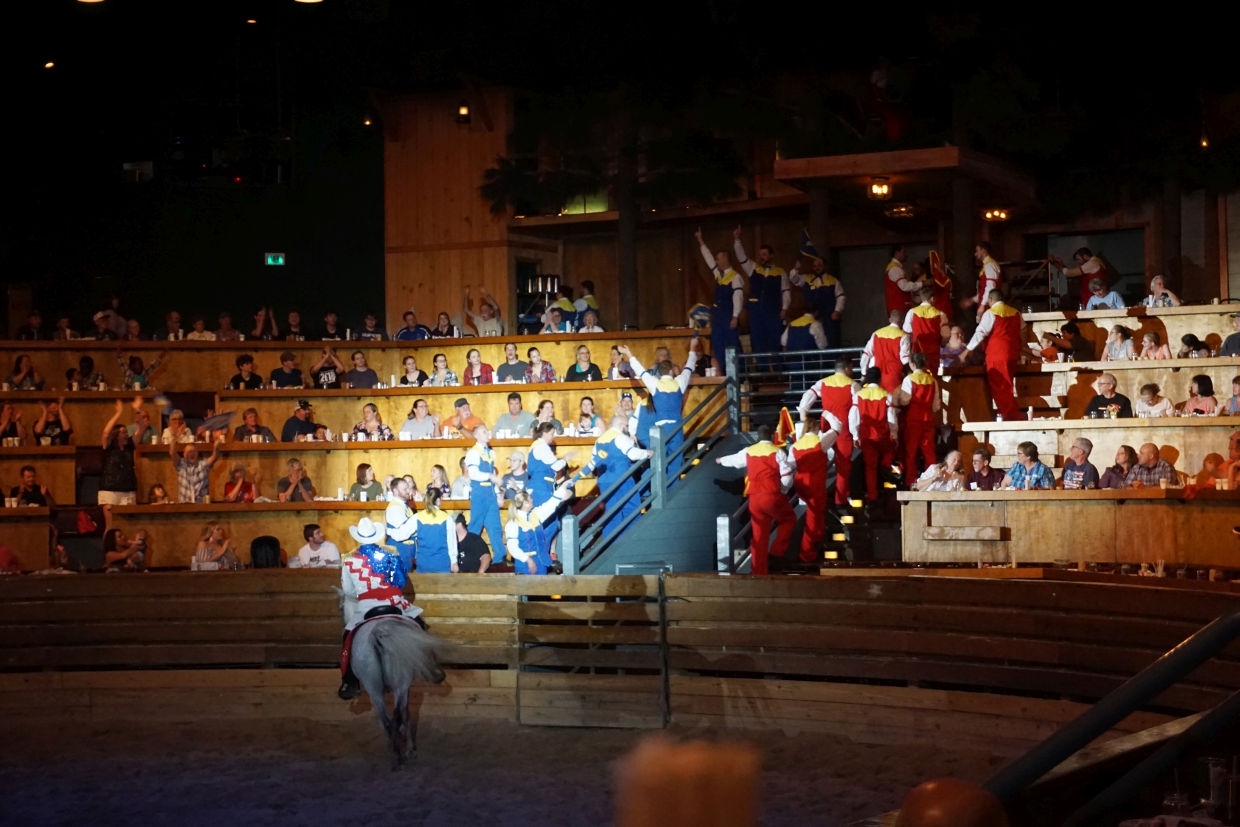 Dann geht es in die Arena. Hier wird ein Kampf zwischen Nord (rot) und Süd (blau) ausgetragen. Cowboys, Cowgirls zeigen ihre Stunts, dazwischen wird getanzt, gelacht und eben auch in verschiedenen Wettbewerben angetreten. Auch das Publikum ist eine der beiden Gruppen zugeteilt und muss mitmachen. Entweder durch anfeuern (bzw. Buh-Rufe) oder im Hufeisenwerfen, Hühnerrennen oder Flaggenlauf. Dazwischen gibt es auch ein Schweine- sowie ein Miniature-Horse-Rennen.