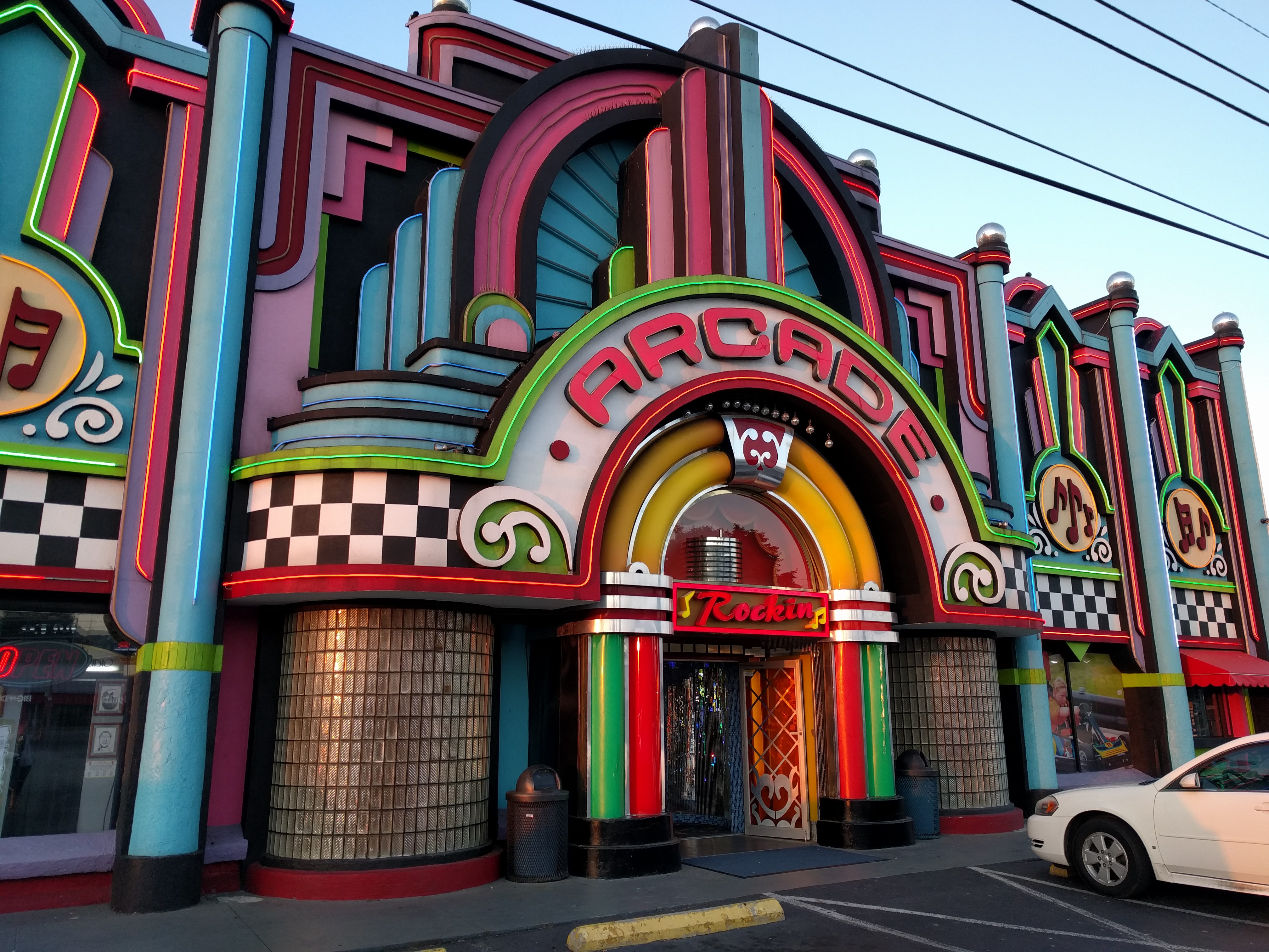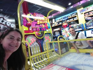 Nachdem wir bei der Fahrt bereits einige Spielhallen gesehen haben, müssen wir wohl in eine gehen und wiedermal ein Airhockey-Match austragen. Der Tisch ist witzig, weil gleich ca. 30 Scheiben gleichzeitig zusätzlich zur eigentlichen Scheibe rausfallen.