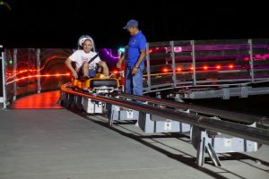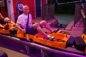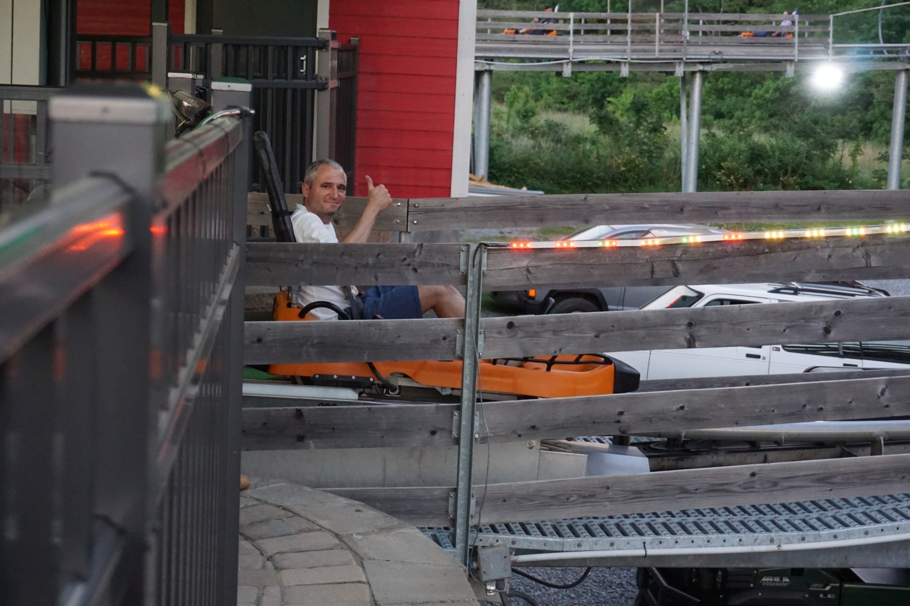 Das ist mit 1,2 km die längste Berg-Rodelbahn in den USA. Man erreicht dabei eine Geschwindigkeit von ca. 43 km/h. In der Nacht ist man dabei umgeben von 300.000 Lichtern. Martin ist mutig und macht die Fahrt.