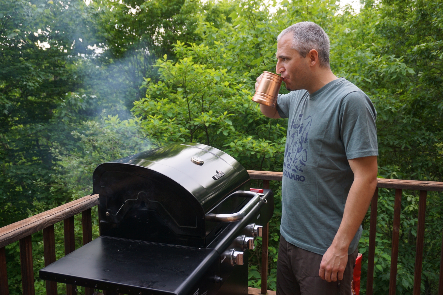 Am Abend waschen wir wieder und Martin wirft den Gasgriller an – natürlich wie es sich gehört mit einem Bier in der Hand. Unsere Steaks schmecken ausgezeichnet! Dazu gibt es Maiskolben, Zwiebel und Brot mit Kräuterbutter. Die Jack Daniel’s Barbecue-Soße passt gut dazu.