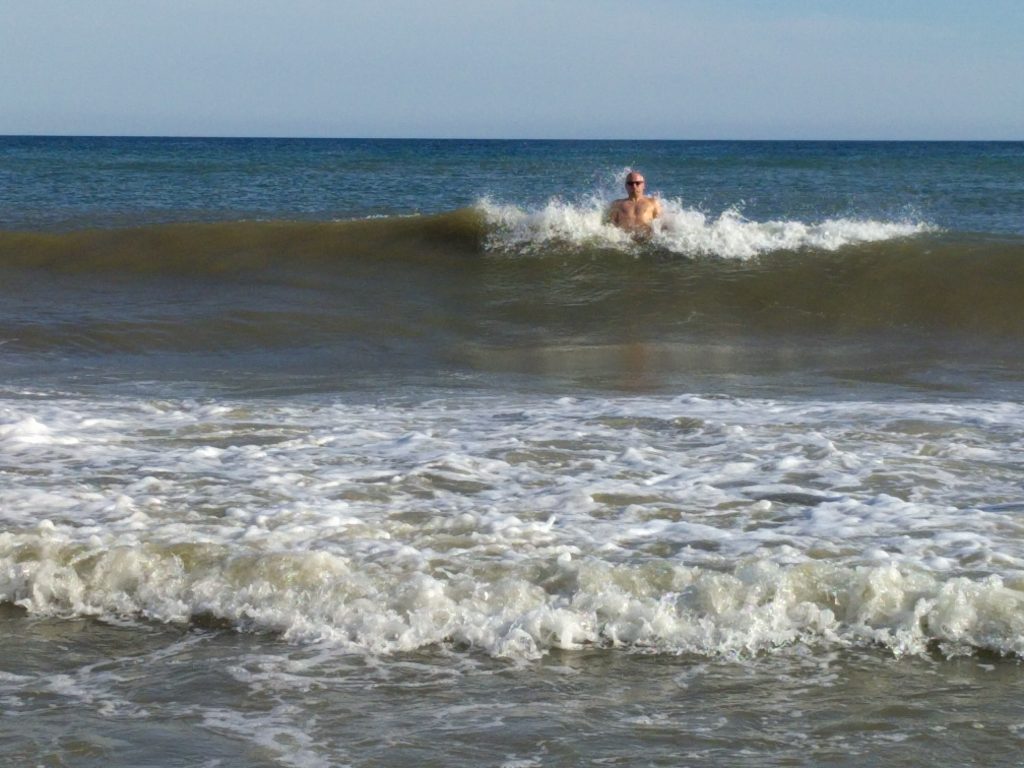 Nicht mal 10 Minuten später sind wir schon am Strand und stecken die Zehen in den feinen weißen Sand. Hier sind die Wellen recht hoch, aber Martin wagt sich hinein. Ein kleiner Spaziergang zum Pier ist auch Pflicht.