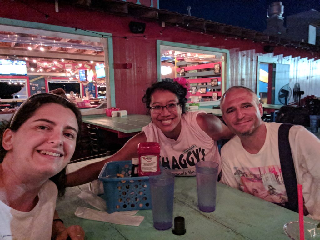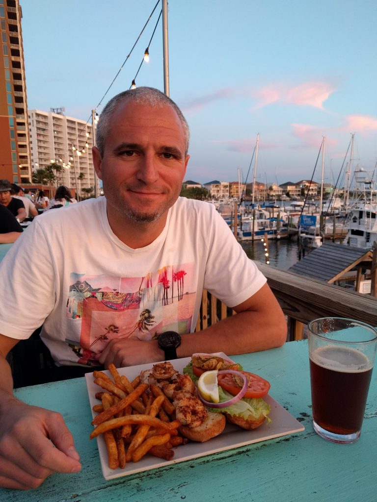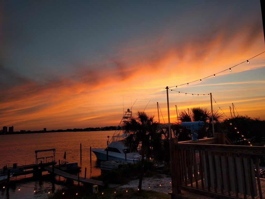 Bei der Fahrt zum Hotel ist uns gleich in der Nähe das Restaurant Shaggy’s aufgefallen, wo wir dann auch hinwandern. Wir finden auf der Veranda Platz mit Blick auf die Bay und werden von unserer netten Kellnerin Cheryl mit Drinks und wirklich ausgezeichnetem Essen bedient. Martin bekommt ein Shrimps-Sandwich und Claudia einen Thunfisch mit Reis. Dazu gibt es Craft-Beer aus Pensacola und einen süßen Summer Smash Cocktail. Um die Stimmung perfekt zu machen haben wir Ausblick auf einen tollen Sonnenuntergang.