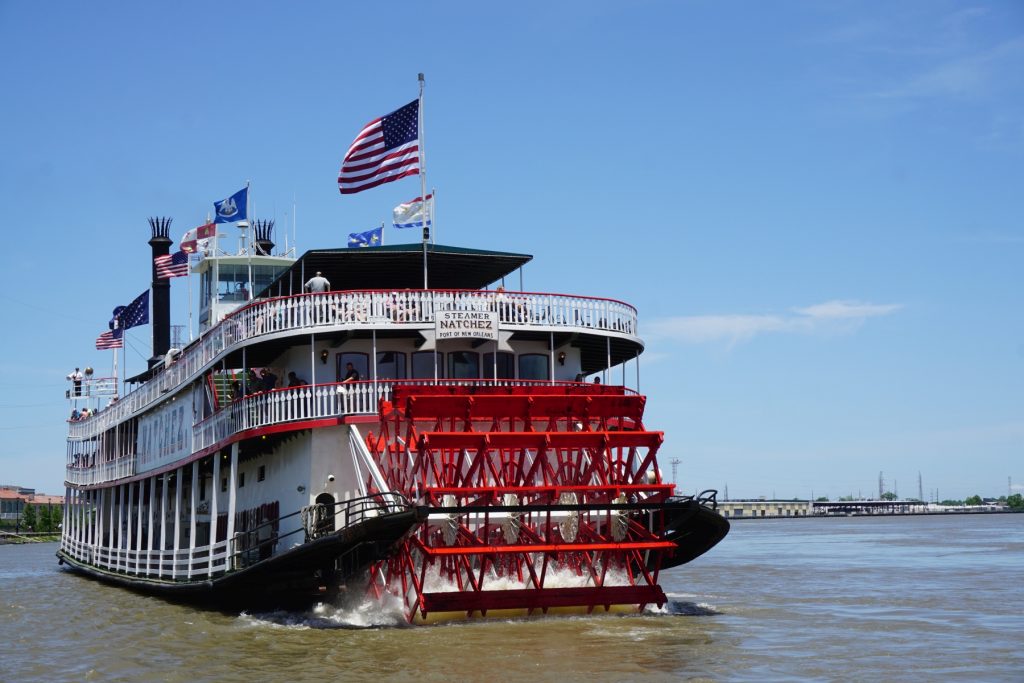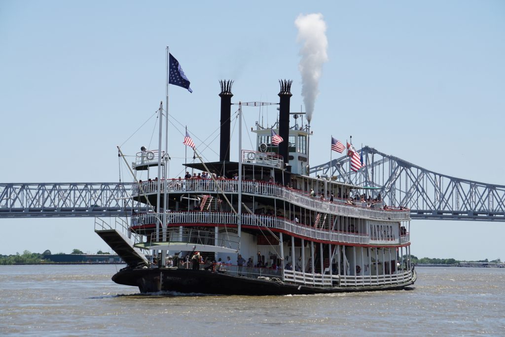Von hier ist es nur noch eine Überquerung der Schienen des Streetcars zum Hafen. Hier beheimatet ist die Natchez. Sie ist der 9. Schaufelraddampfer mit diesem Namen und schippert seit 1975 vom Hafen New Orleans aus den Mississippi entlang.