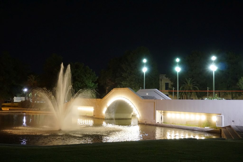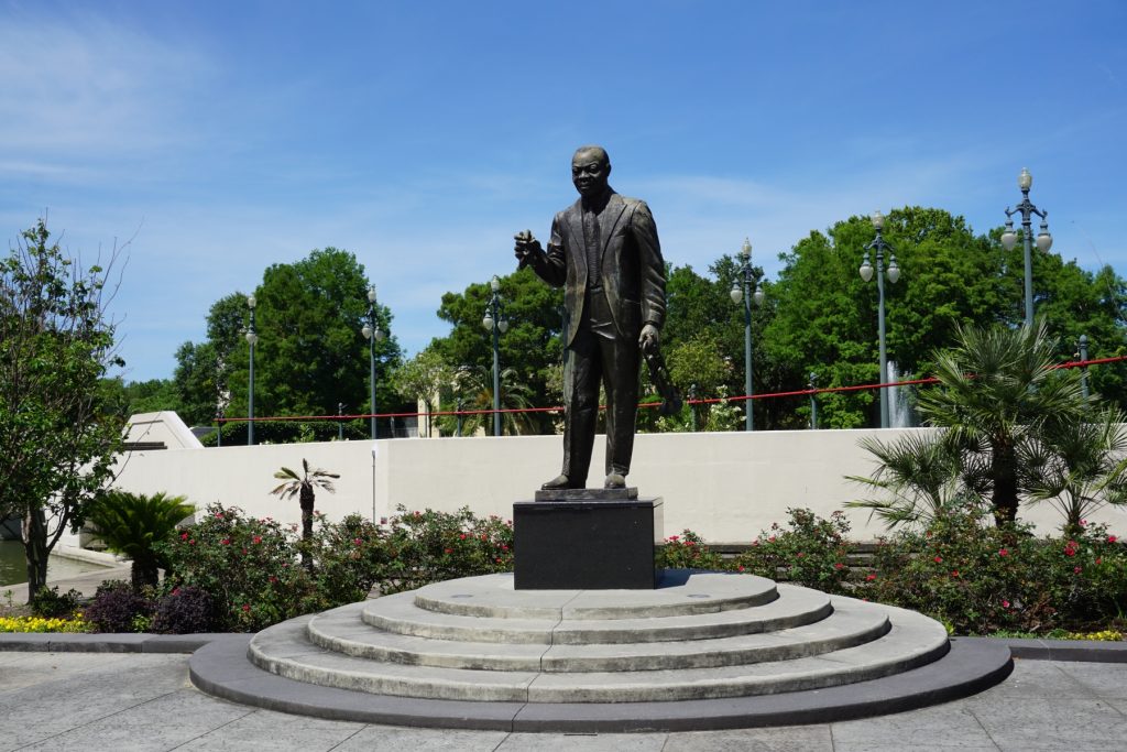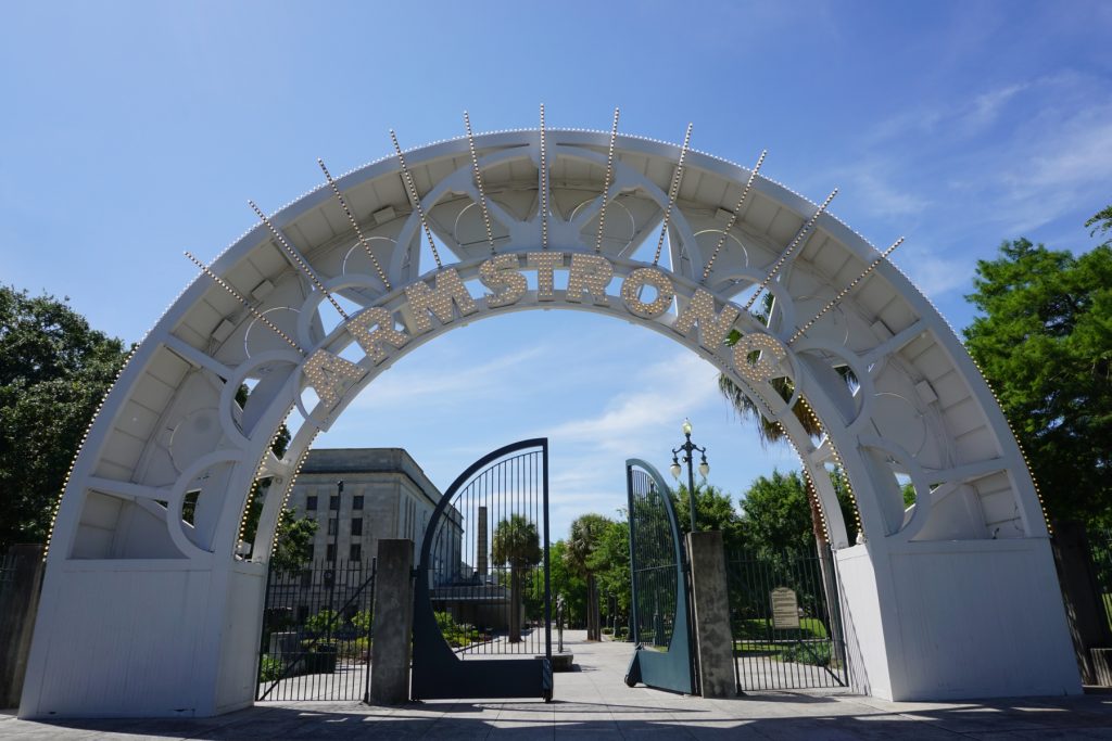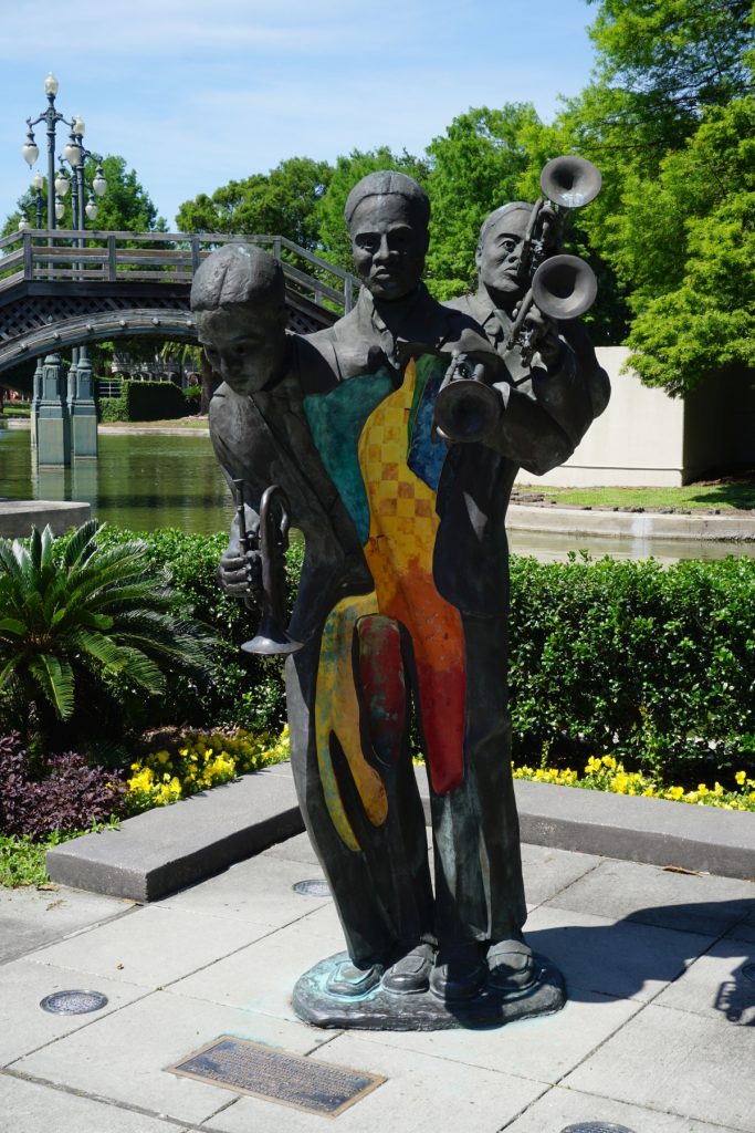 Nur ein paar Straßen weiter ist der Louis Armstrong Park. Ein kleiner Park mit kleinen Brücken, Wasser und einigen Statuen zu Thema Musik. Eine davon ist selbstverständlich Louis „Satchmo“ Armstrong. Am Congo Square gleich nebenan trafen sich die Sklaven früher immer um gemeinsam zu Musik zu tanzen. Am Abend sind die Brücken und das Eingangstor schön beleuchtet und wir treffen eine Gruppe Musiker mit Mardi Gras Verkleidung.