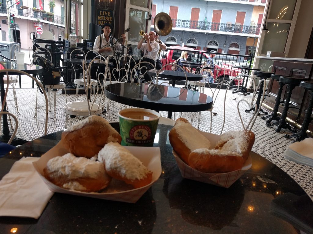 Als kleine Pause bietet sich das berühmte Café du Monde an. Hier gibt es die angeblich besten Beignets, eine französische Süßigkeit ähnlich zu unseren Gebackenen Mäusen. Die Leute stehen dafür Schlange! Wir verspeisen unsere eine Ecke weiter im Schatten, weil die Sonne brennt. Sie schmecken wirklich sehr gut, wir sind danach nur über und über voll mit Puderzucker! Am 2. Tag genießen wir sie in einem anderen Café du Monde und haben sogar Livemusik!