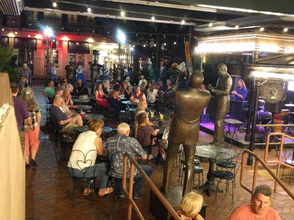 Am frühen Abend wanderten wir die Bourbon Street entlang und entdecken eine weitere Sehenswürdigkeit von New Orleans: Den Musical Legends Park. Hier stehen 8 musikalische Künstler als Bronzefiguren und diese wiederum stehen mitten im Café Beignet, wo es jeden Abend live Jazz-Musik von Steamboat Willie gibt. Ich verrate es gleich: wir waren hier an jedem Abend, weil es hier wirklich stimmungsvolle, gute Musik gibt. Außerdem gibt es gutes lokales Bier (Abita), leckere Cocktails und Kleinigkeiten zu essen. Wir kosten selbstverständlich die einheimischen Gerichte Jambalaya (ähnlich unserem Reisfleisch), Gumbo (eine Suppe mit Reis und Fleisch) und Po-Boy (ein Sandwich) mit Shrimps. Es schmeckt und die Band (Steamboat Willie) ist wirklich fantastisch!