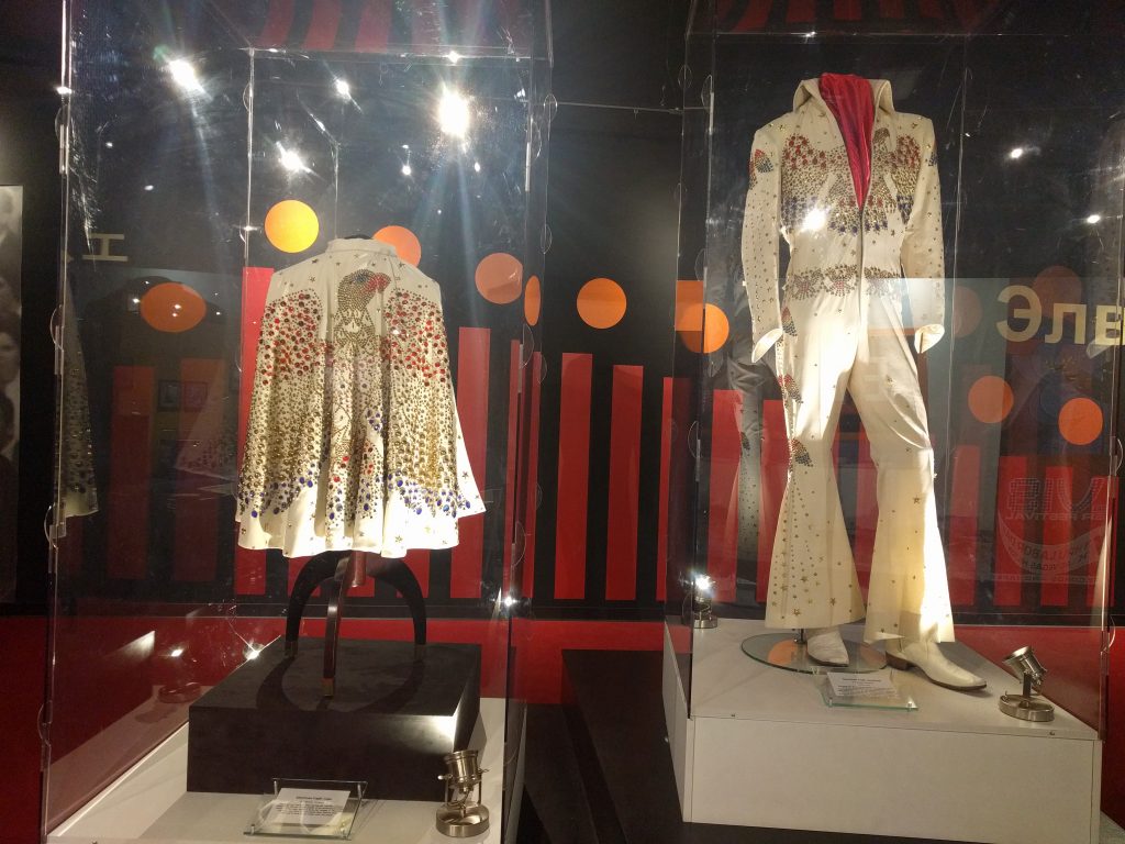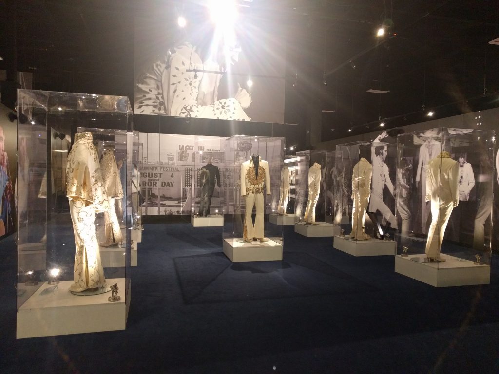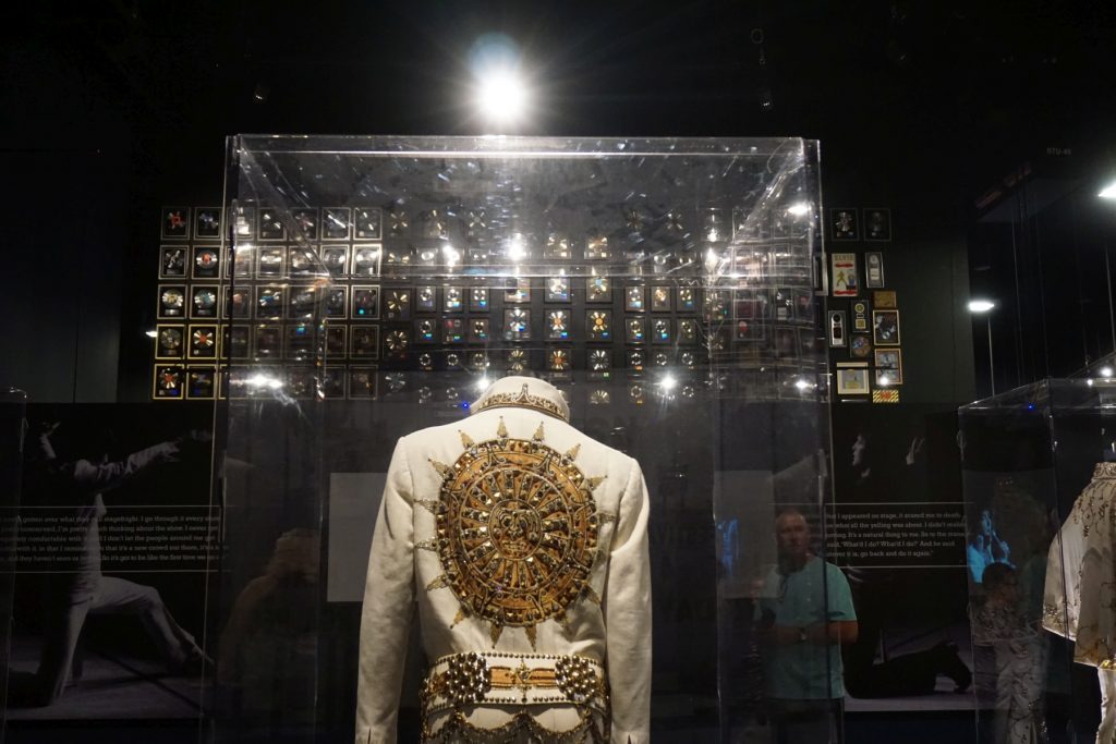 Nach einer kleinen Pause im VIP Raum, der noch einige Schmuckstücke von Elvis zeigt, sehen wir uns die Ausstellung zu seinen Filmen und einige seiner Kostüme an. Den berühmten weißen Anzug gab es übrigens doppelt, denn nach einem Konzert war der so durchgeschwitzt, dass er nicht bis zum nächsten Auftritt trocken wurde.