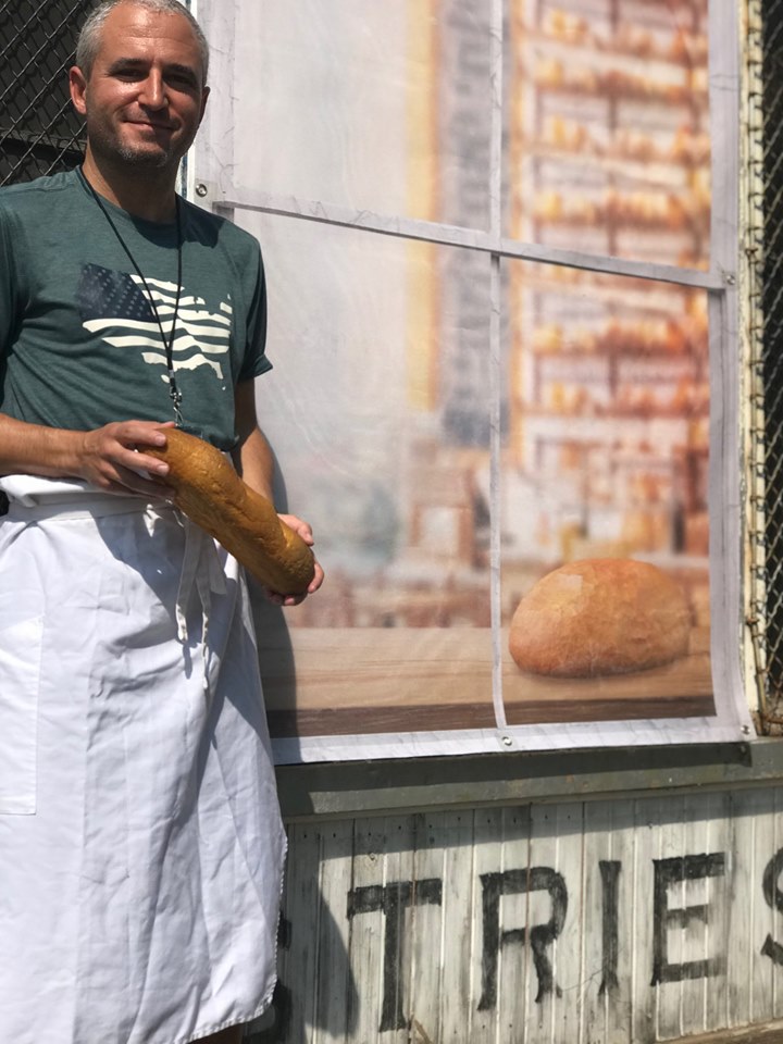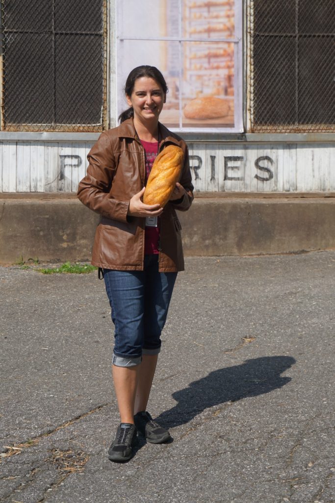 Immer wieder stellen wir auch die eine oder andere Szene nach: Martin und ich dürfen gleich zu Beginn die Szene vor der Bäckerei nachstellen, wo Peta das verbrannte Brot Katniss zuwirft.