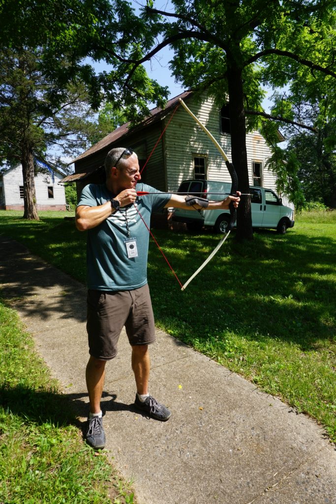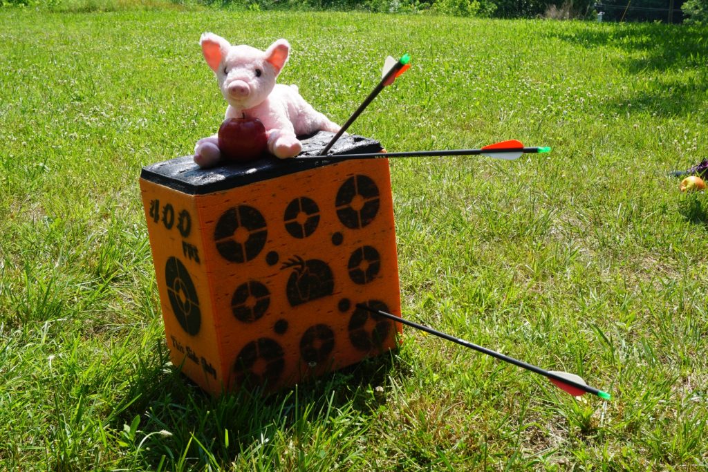 Dann bekommen wir eine kleine Einschulung ins Bogenschießen. Wir dürfen etwas üben und wie im Film ist unser Ziel ein Schwein mit einem Apfel. Der Apfel ist nur anfangs das Ziel, dann zielen alle nur noch auf das Schwein…