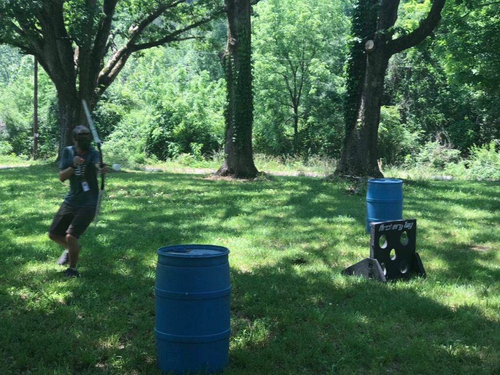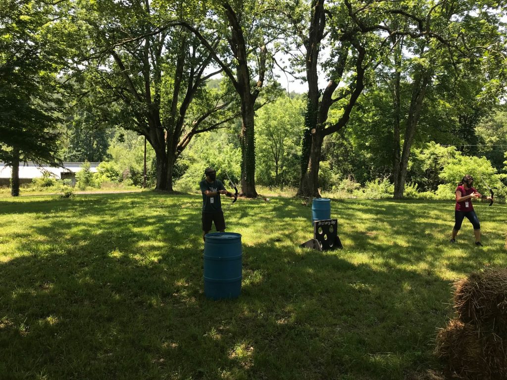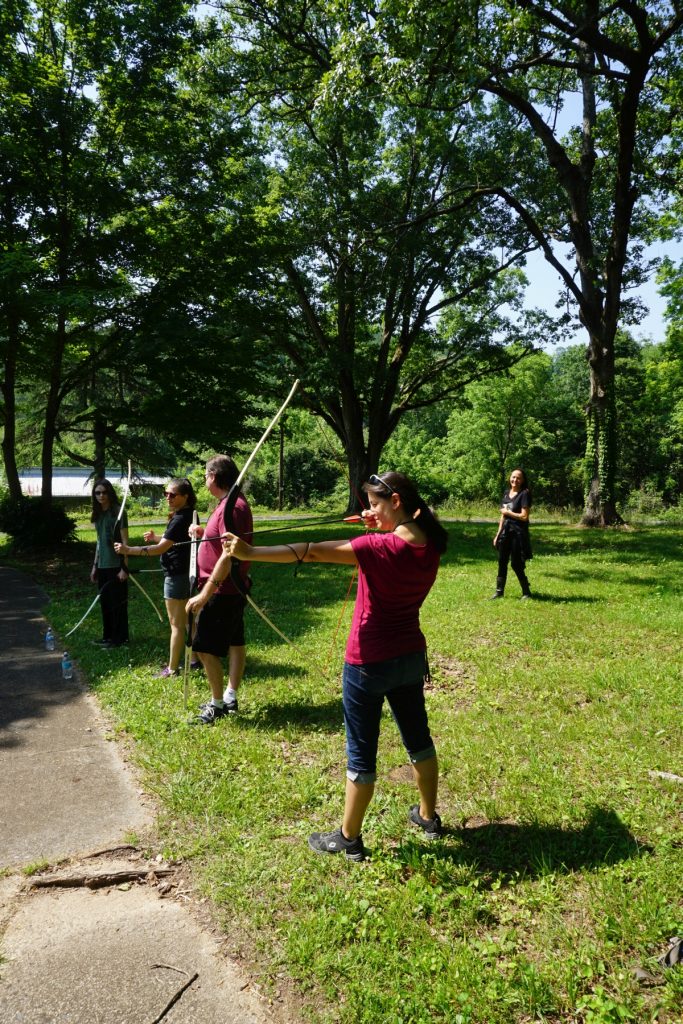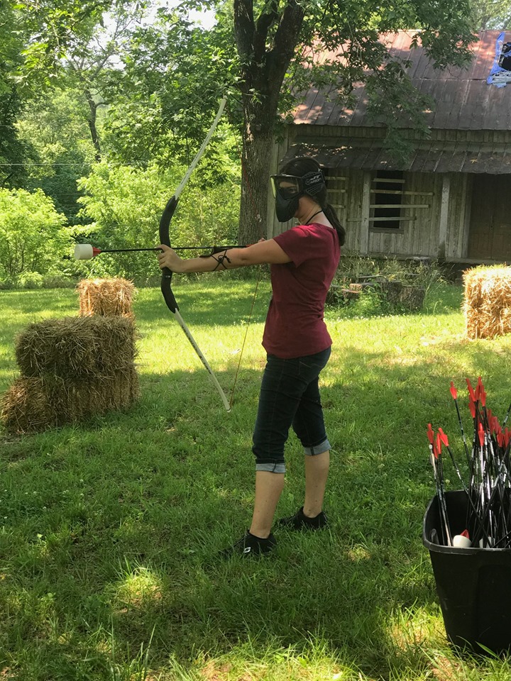Dann spielen wir Archery-Tag. Also Lasertag nur mit Pfeil und Bogen. Martin und Claudia gegen eine 3-köpfige Famile. Das ist vielleicht ein Spaß! Eine Runde dauert 4 Minuten: Wer getroffen wird muss ein paar Sekunden aus dem Spiel. Punkte bekommt man, wenn man den Gegner trifft oder durch eines der gegnerischen Tore trifft. Es ist ziemlich heiß und richtig anstrengend. Wir entscheiden am Ende, dass es ein Unentschieden war, aber wir sind der Meinung, dass wir um einiges mehr Treffer erzielt haben.