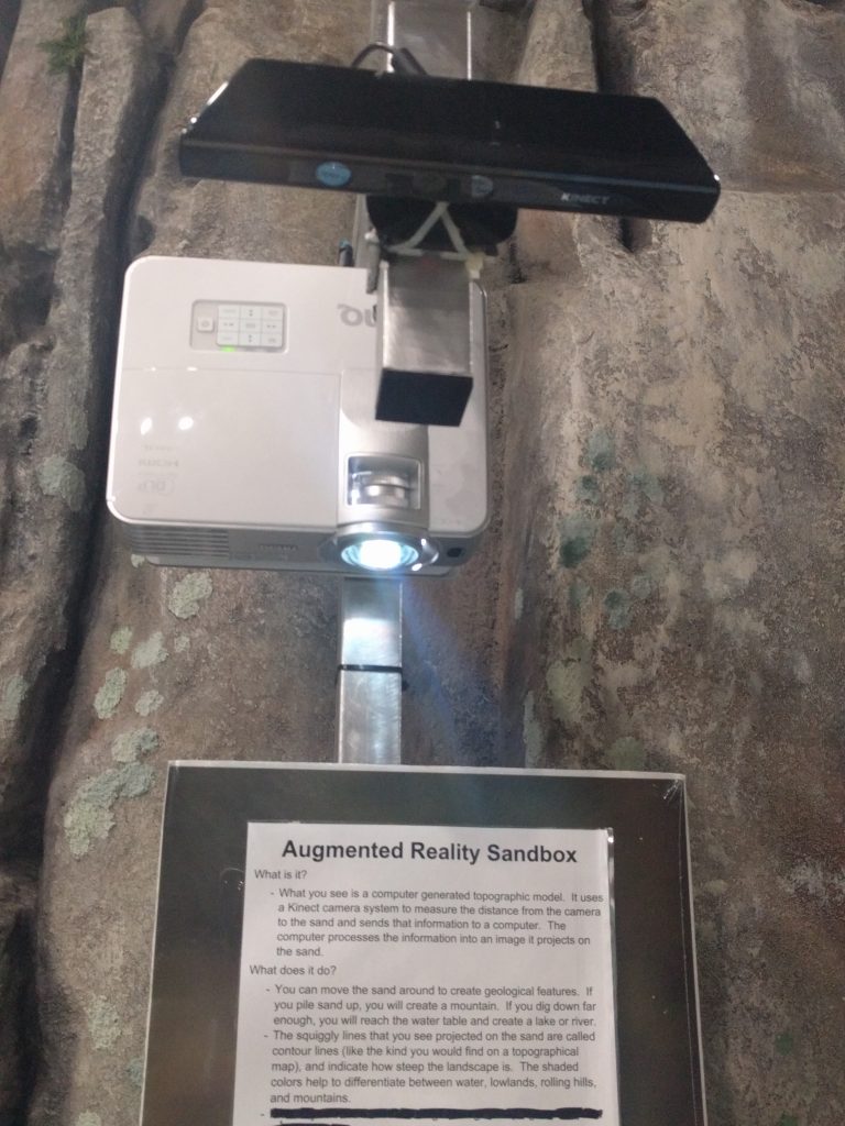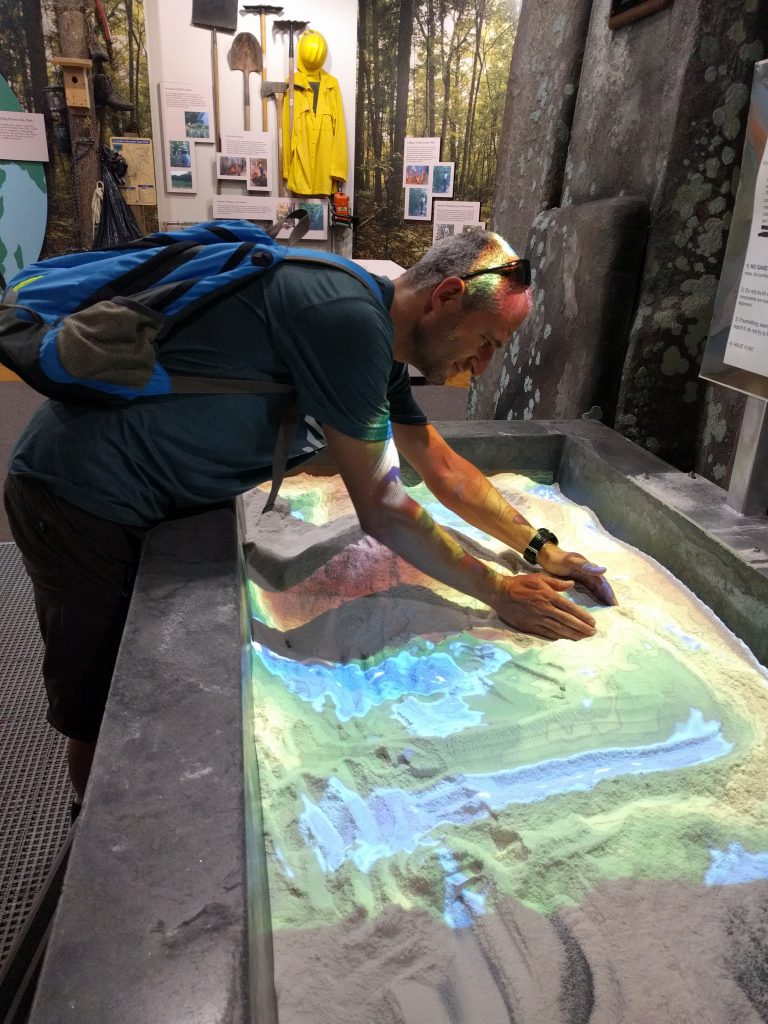 Danach fahren wir ca. 1 Stunde Richtung Süden in den Crowders Mountain State Park. Dort besuchen wir das Visitor Center und informieren uns wieder über Flora und Fauna. Auch gibt es dort eine Augmented Reality Sandbox, mit der Martin gleich spielt 😉