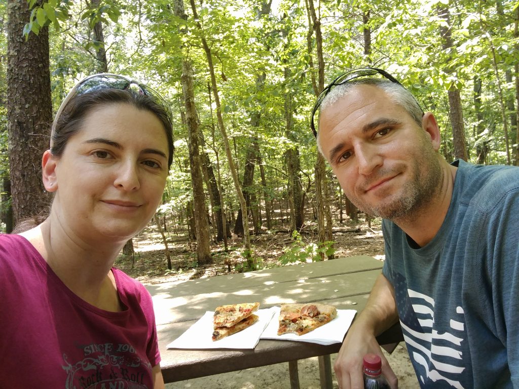 Dann haben wir uns 3 Trails ausgesucht, die wir erwandern. Bevor es aber losgeht stärken wir uns noch mit einem Stück Pizza.