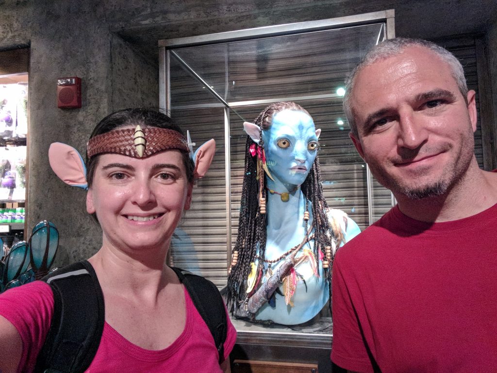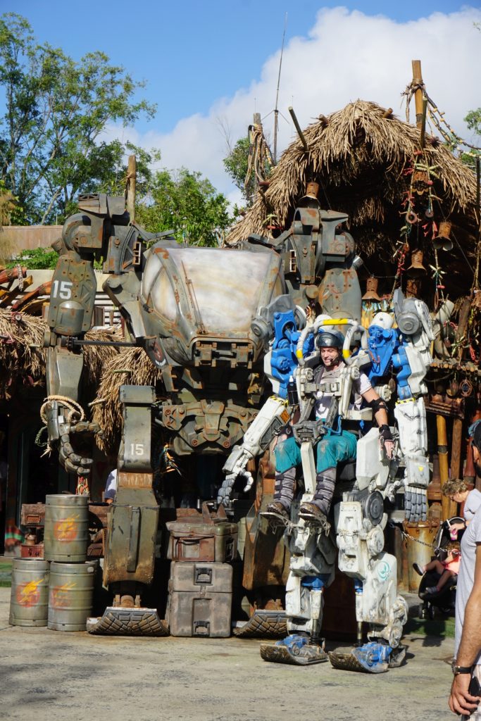 Nach diesem Abenteuer schauen wir uns im Shop kurz um, probieren Na’vi-Ohren und erkunden dann die Welt von Pandora. Wir sehen seltsame teils qualmende Pflanzen, Wasserfälle, hohe Felsen und finden wasserspeiende Tiere. Auch einem Pandora Ranger in seinem 3 m hohen Roboter-Anzug begegnen wir.