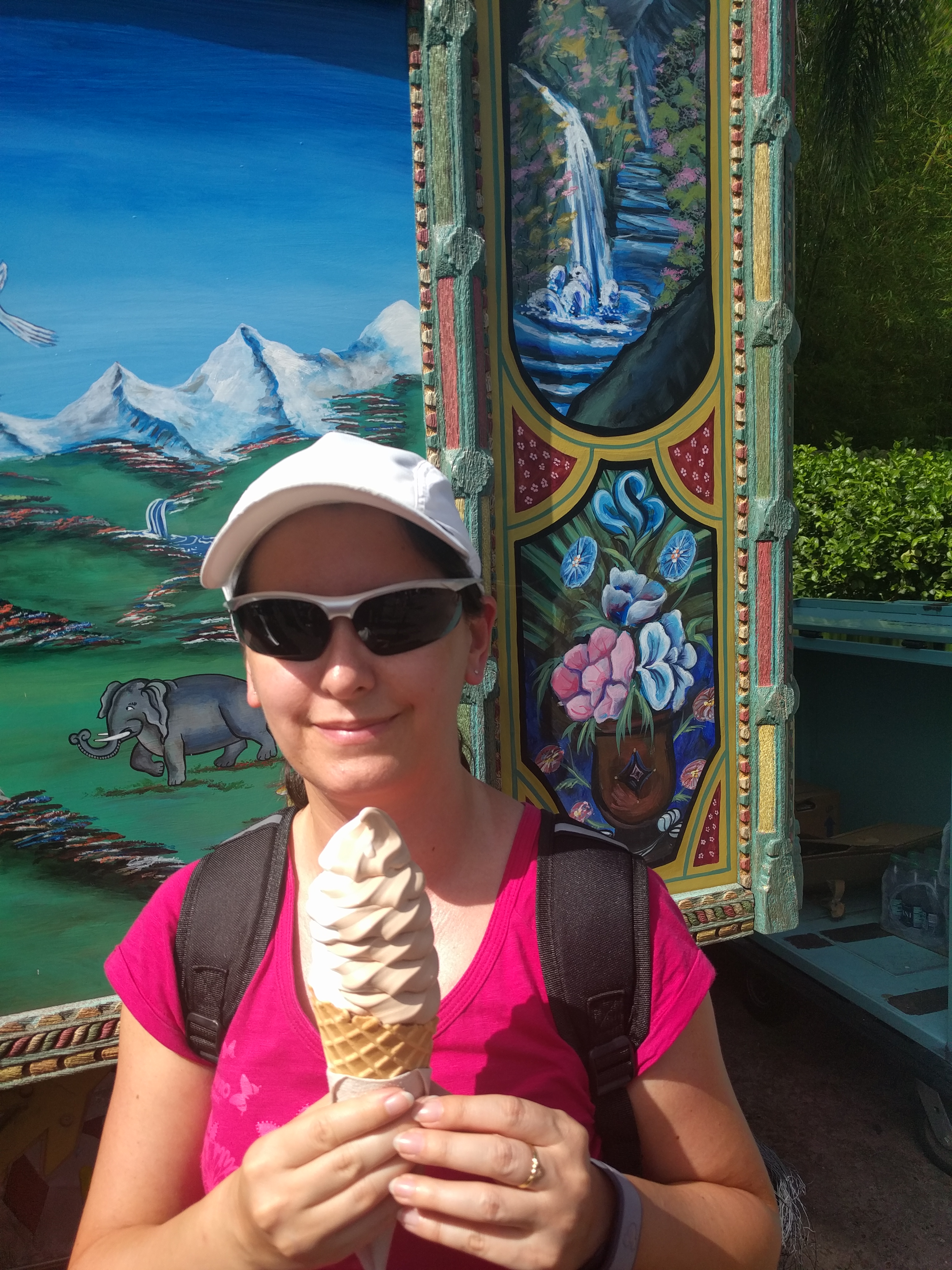 In der Hitze gönnen wir uns ein leckeres Eis – das schneller rinnt als Claudia es essen kann 😉