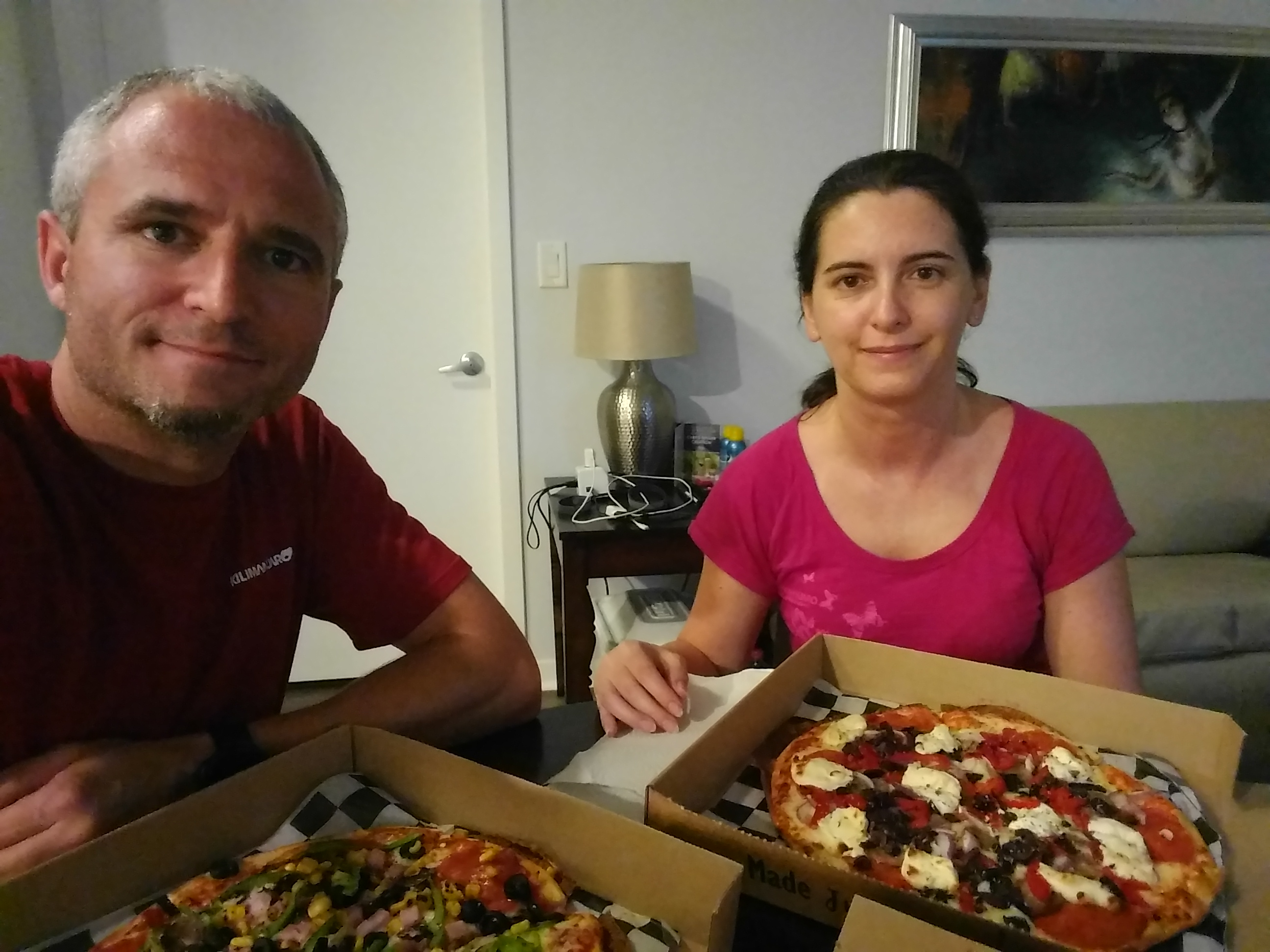 Jetzt wandern wir etwas kaputt zum Parkplatz, nehmen unterwegs noch von der Pizza Press unser Abendessen mit, das wir dann im Hotel verputzen.