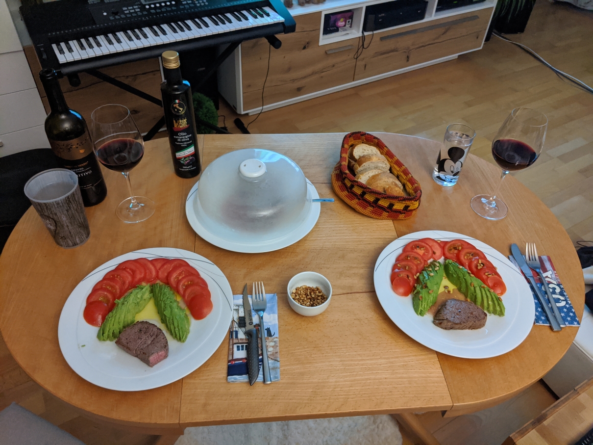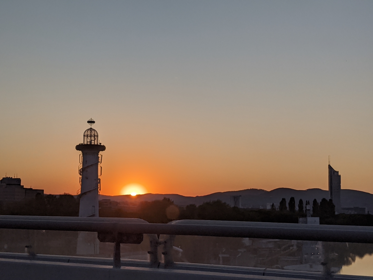 Nach so vielen Anstrengungen haben wir uns ein Abendessen verdient. Wie im Urlaub gönnen wir uns ein leckeres Steak und genießen ein gutes Glas Wein dazu! Der Sonnenuntergang in Wien mit unserem Leuchtturm ist wie immer toll anzusehen!