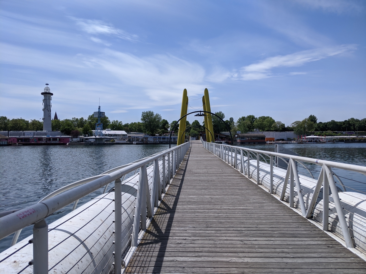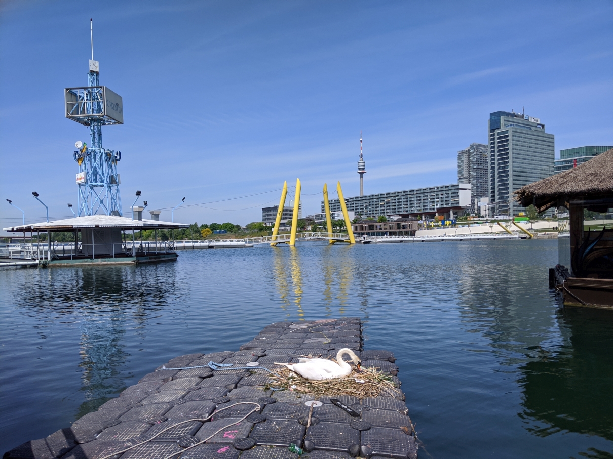 Schon vor einiger Zeit haben wir ein Foto eines kleines Gewässers auf der Donauinsel gefunden, das wir unbedingt mal besuchen müssen. Jetzt machen wir uns auf die Suche danach. Wir beginnen unseren Spaziergang beim Copa Beach, wo wir einen Graureier beim Fischefangen beobachten – Wahnsinn! Der leere Steg hat Seltenheitswert und es sind so wenig Menschen derzeit unterwegs, dass die Schwäne sogar die Schwimminseln als Brutplatz nützen!
