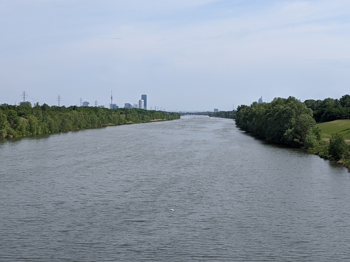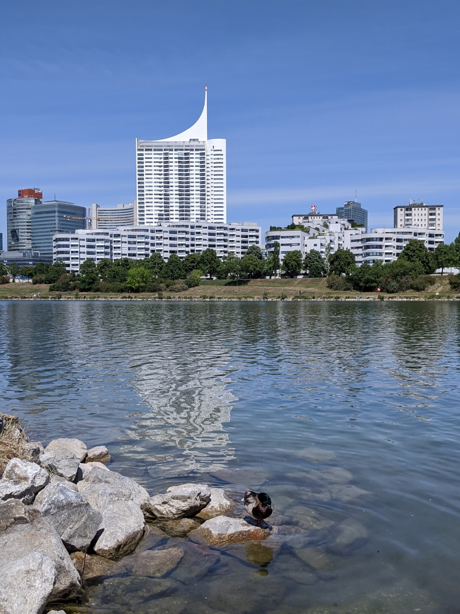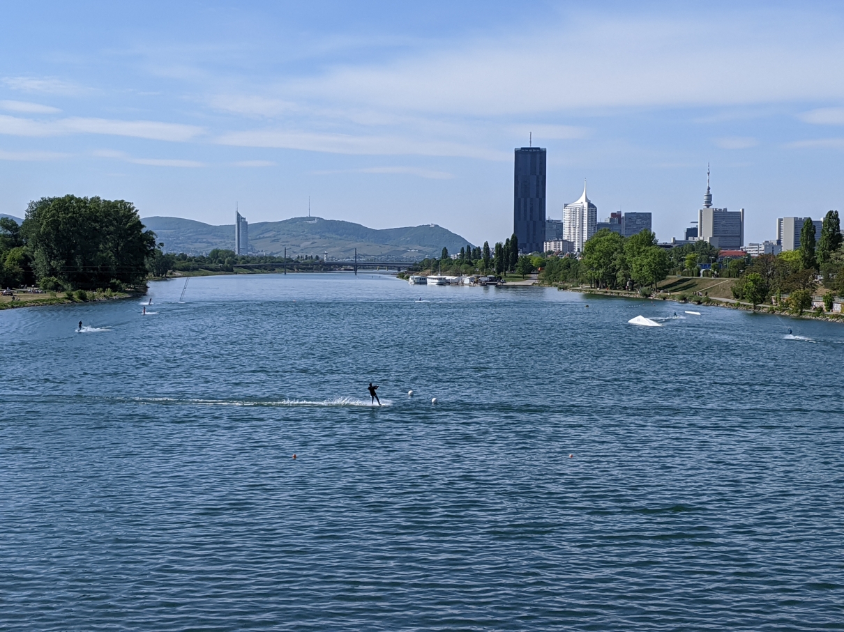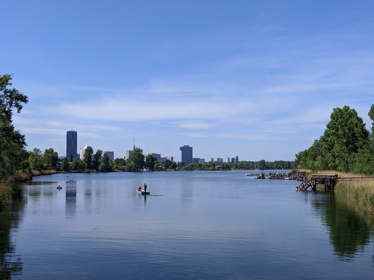 Unser Weg führt uns hinüber zur Alten Donau, wo wir den Ausblick auf das Wasser genauso genießen wie die Skyline in der Ferne. Und wo wir schon mal in Kaisermühlen sind… ist ein Besuch beim Eissalon Trento eigentlich Pflicht!