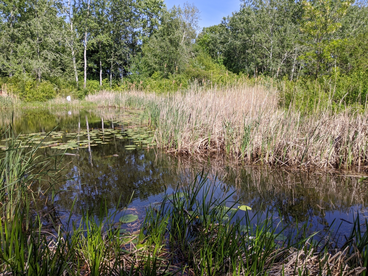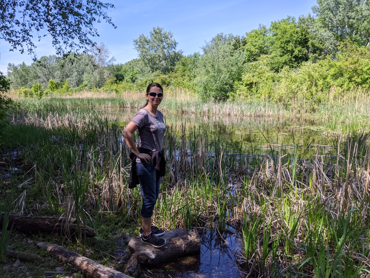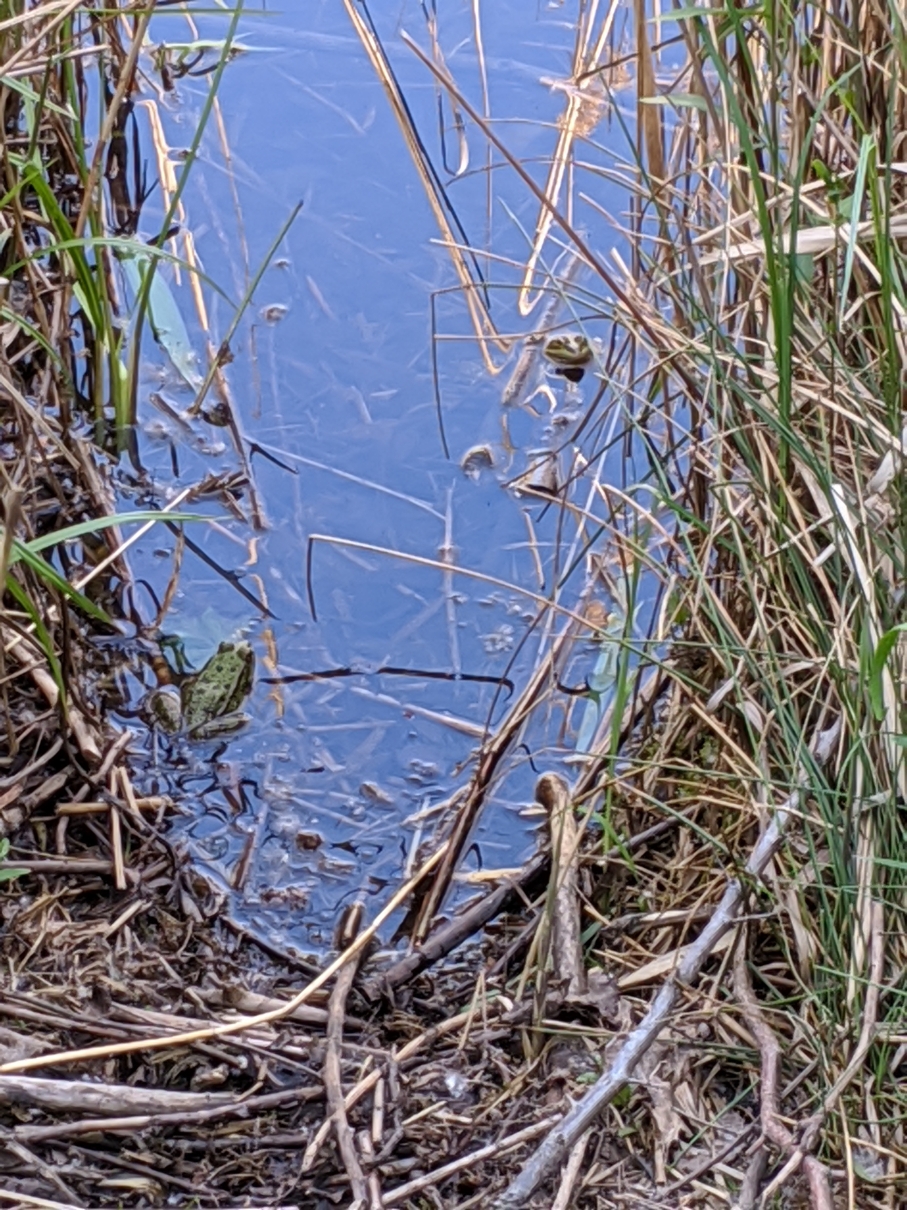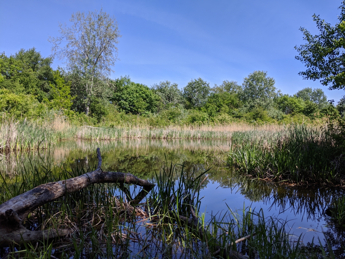 Google Maps zeigt uns, dass wir jetzt unserem eigentlichen Ziel ganz nah sind. Wir kämpfen uns durch das Dickicht und staunen nicht schlecht, dass sich hier mitten auf der Donauinsel wirklich ein kleiner Wald befindet. Aus der Ferne hören wir lautes Quaken und wissen damit, in welche Richtung wir müssen. Toll was sich uns zeigt: Das Tritongewässer, ein kleiner Teich mit hohem Schilf, verwitterten Bäumen und vielen laut quakenden Fröschen und Kröten.