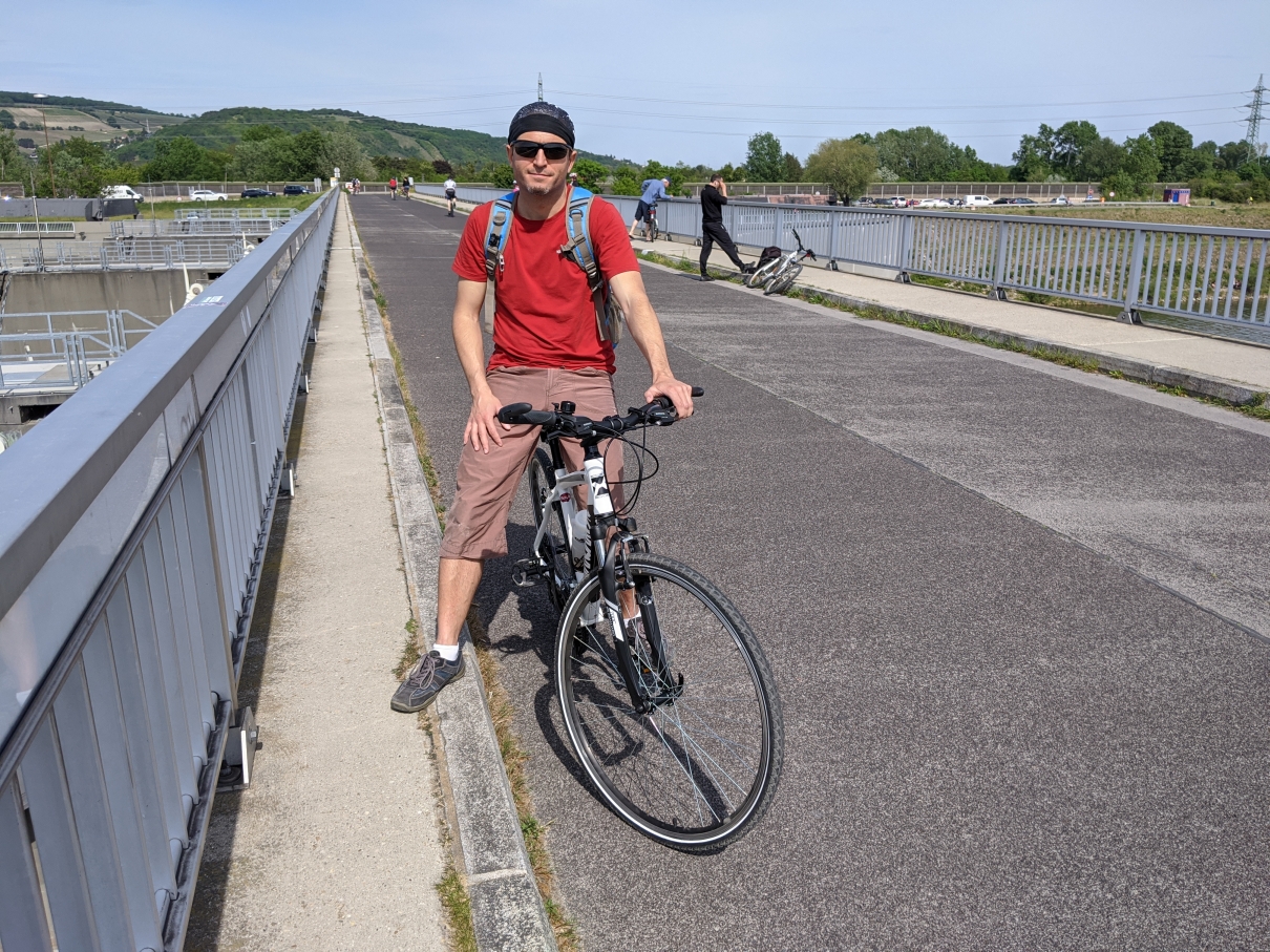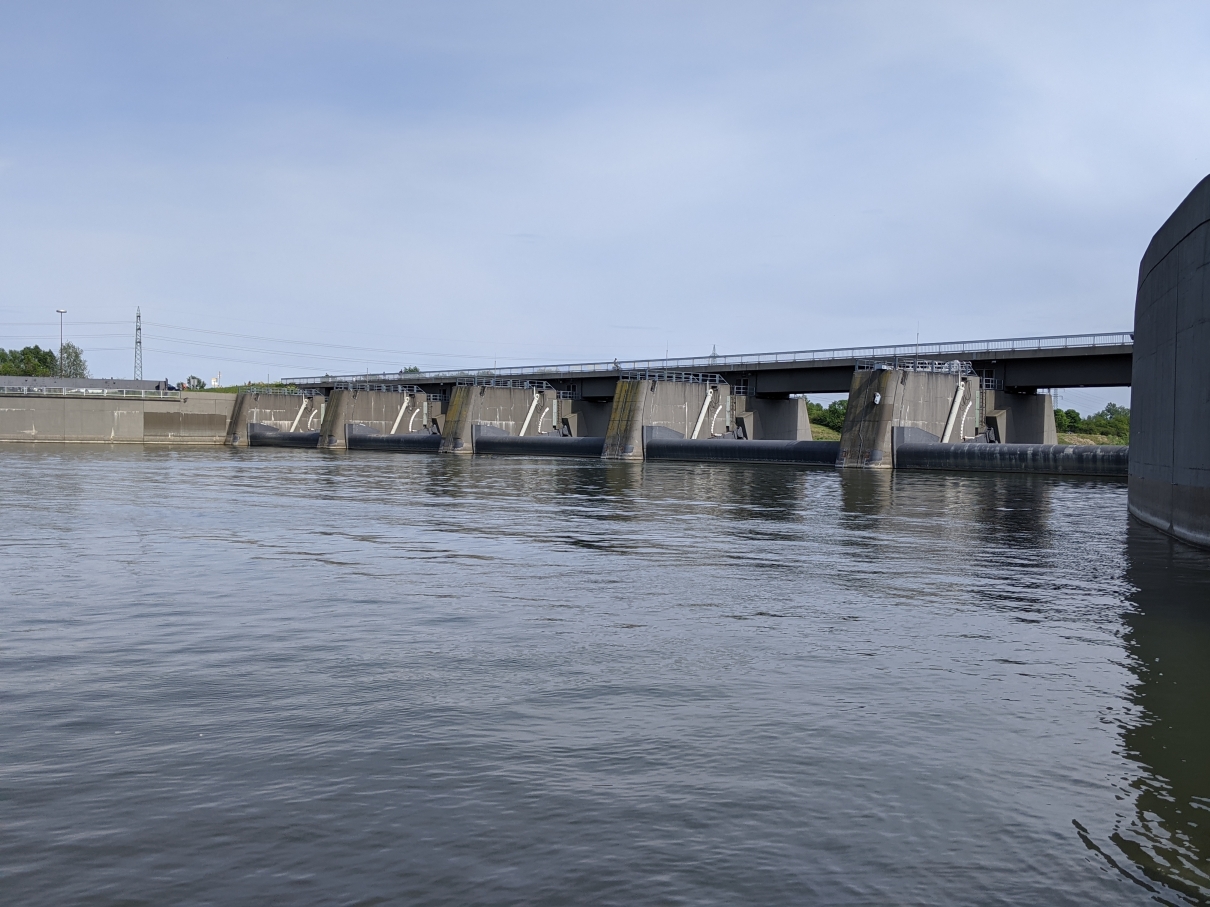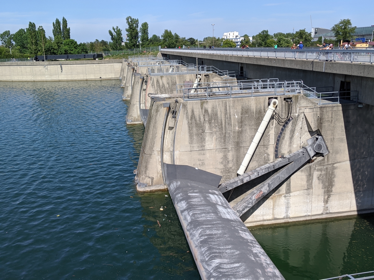 Jetzt gehen wir über die Wehr, wo wir den Wakeboardern zusehen und den Blick auf die Donau genießen.