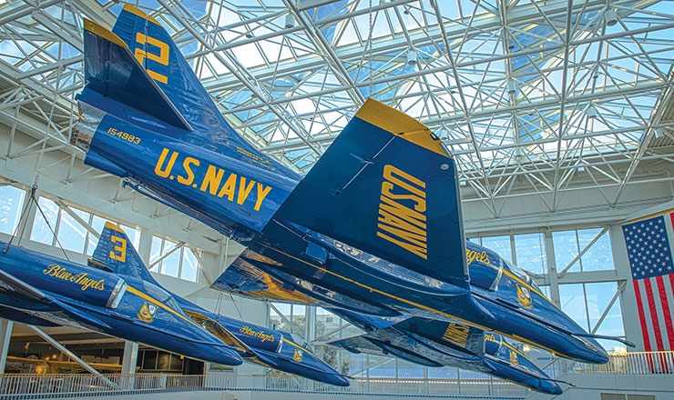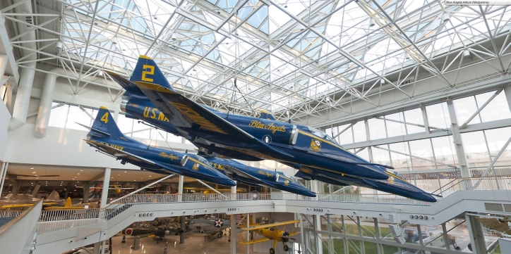 Das für Claudia Spannendste sind aber die Modelle der Blue Angels. In einem eigenen Atrium hängen die A-4 Skyhawks der Blue Angels. Drei der blauen Flieger, die tatsächlich Gefechte in Vietnam geflogen sind, hängen hier von der Decke.
