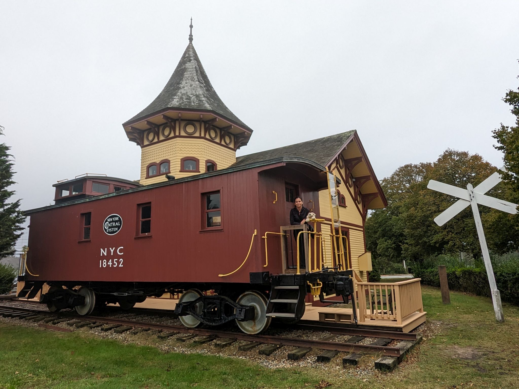 Erster Stopp ist das Chatham Railroad Museum, das sehr klein und geschlossen ist, aber auch von außen sehr nett anzusehen ist. Das Museum ist ein historisches Bahnhofsgebäude, das 1887 als Haltepunkt der Old Colony Railroad errichtet wurde. 1930 wurde der Bahnhof stillgelegt und seit 1960 befindet sich dort das Chatham Railroad Museum. Hinter dem Gebäude steht ein Schlusswagen aus dem Jahre 1910, der mehr als 1 Million Meilen am Ende von Güterzügen zurücklegte, die zwischen New York City und Chicago verkehrten. Hundn klettert sofort hinauf.