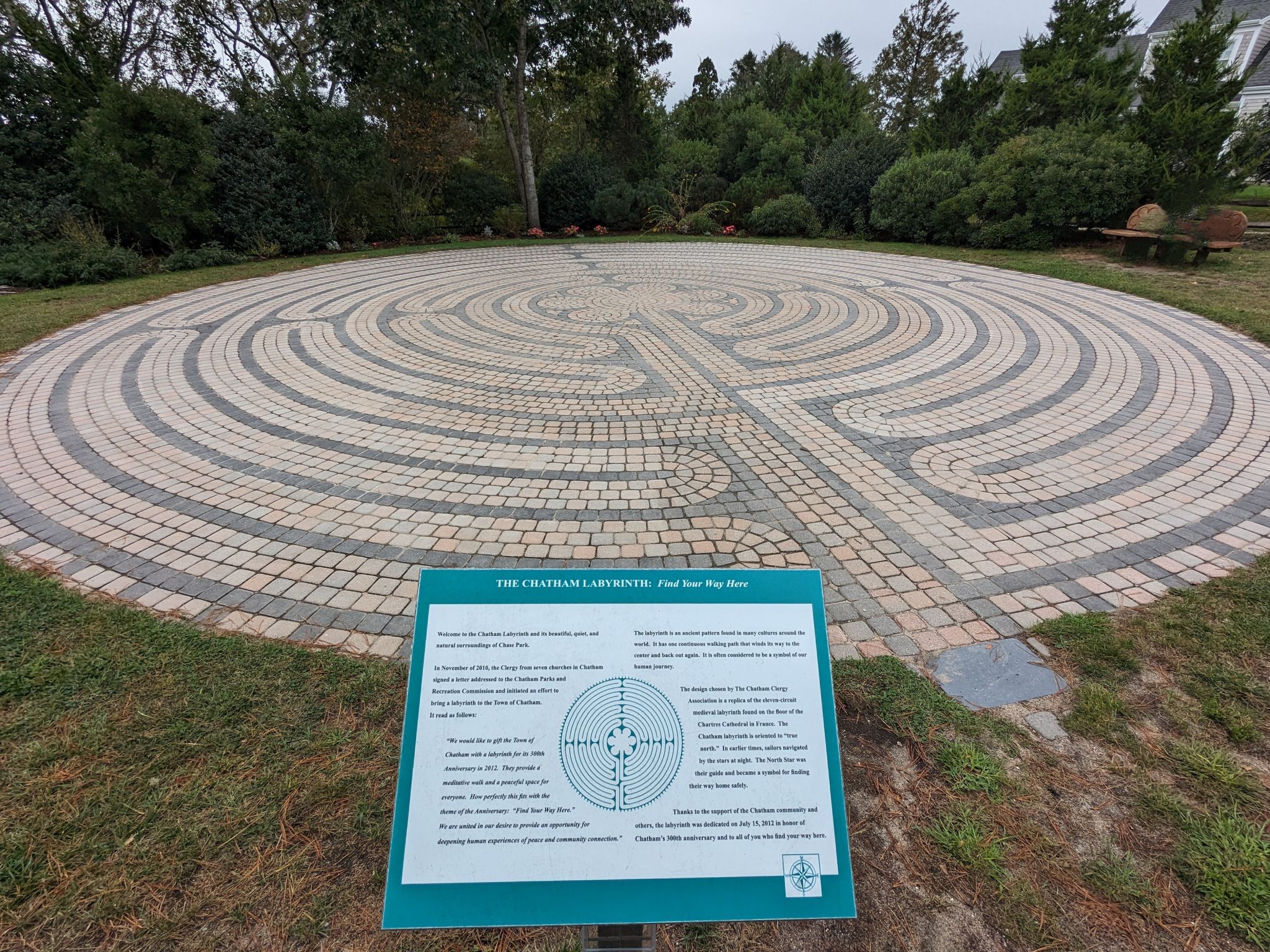 Gleich nebenan gibt es ein „Labyrinth“, welches eine Nachbildung des 11-gängigen mittelalterlichen Labyrinths ist, das im Boden der Kathedrale von Chartres in Frankreich zu finden ist. Alles ist proportional zueinander, was dazu beiträgt, Harmonie zu schaffen und Energie fließen zu lassen. Es ist also kein Labyrinth, wo man sich verlaufen kann, sondern ein langer Weg für einen entspannenden Spaziergang.