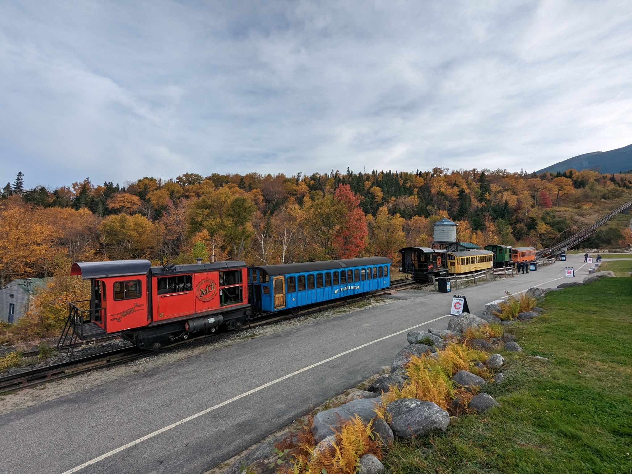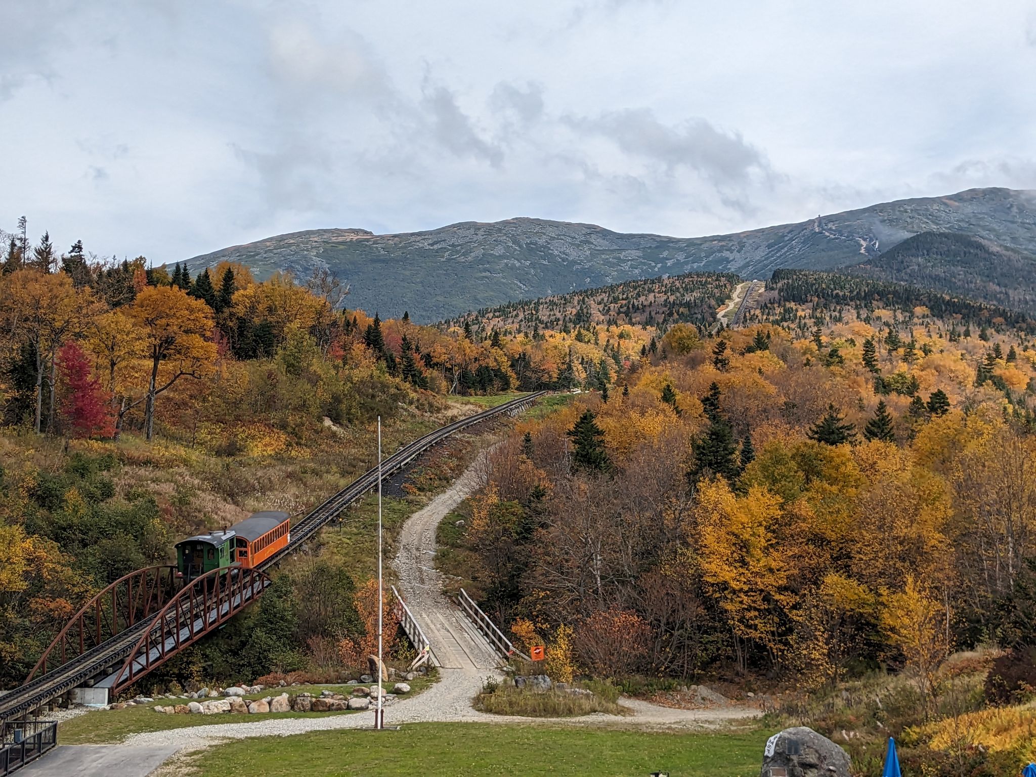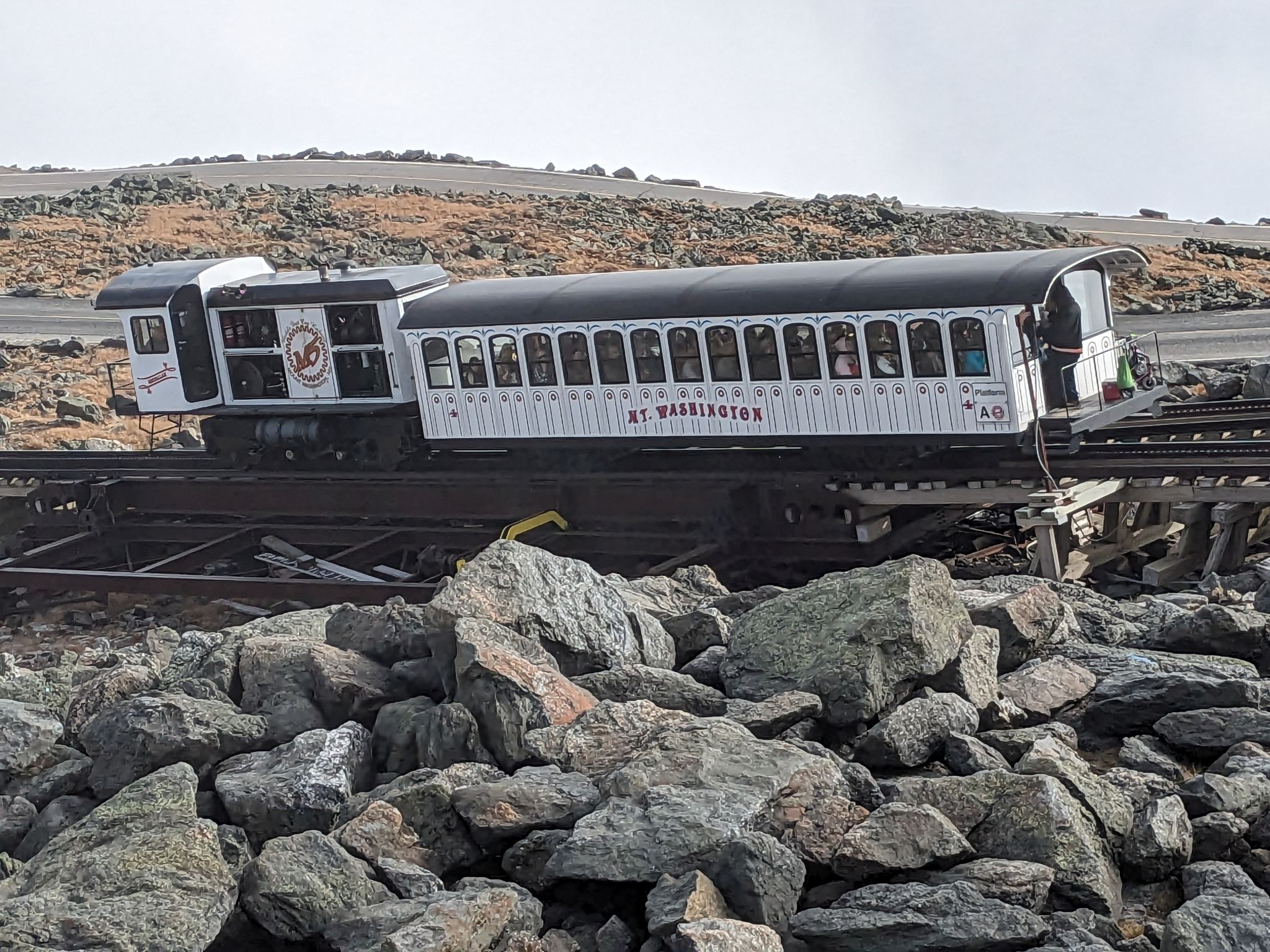Es gibt 3 Wege hinauf: eine schweißtreibende Wanderung, eine kurvenreiche Autofahrt oder bequem per Zahnradbahn. Wir wählen die Mount Washington Cog Railway, welche die erste Zahnradbahn der Welt war. Unsere Lok ist grün und der Waggon Orange und unser Bremser und Entertainer ist Terry. Er erzählt uns während dem 40-minütigen Aufstieg alles, was es über die Bahn und den Mount Washington spannendes gibt.