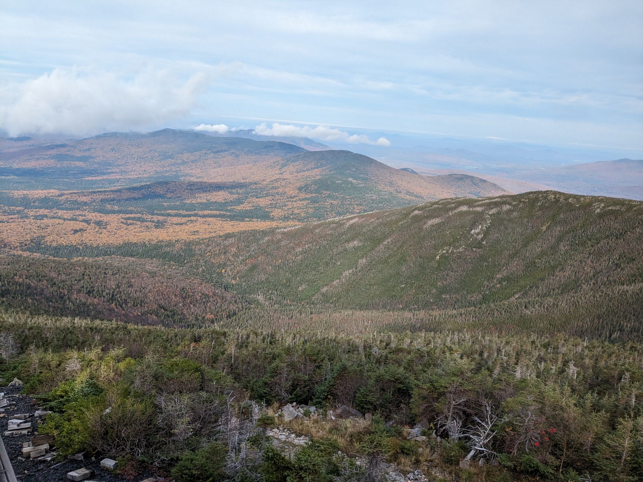 Nach dem Aufwärmen riskieren wir noch einmal einen Blick in die Ferne. Der Nebel gibt ab und zu einen kleinen Ausschnitt mit Blick auf den Indian Summer frei und die Wolken unter uns sehen wie Watte aus.