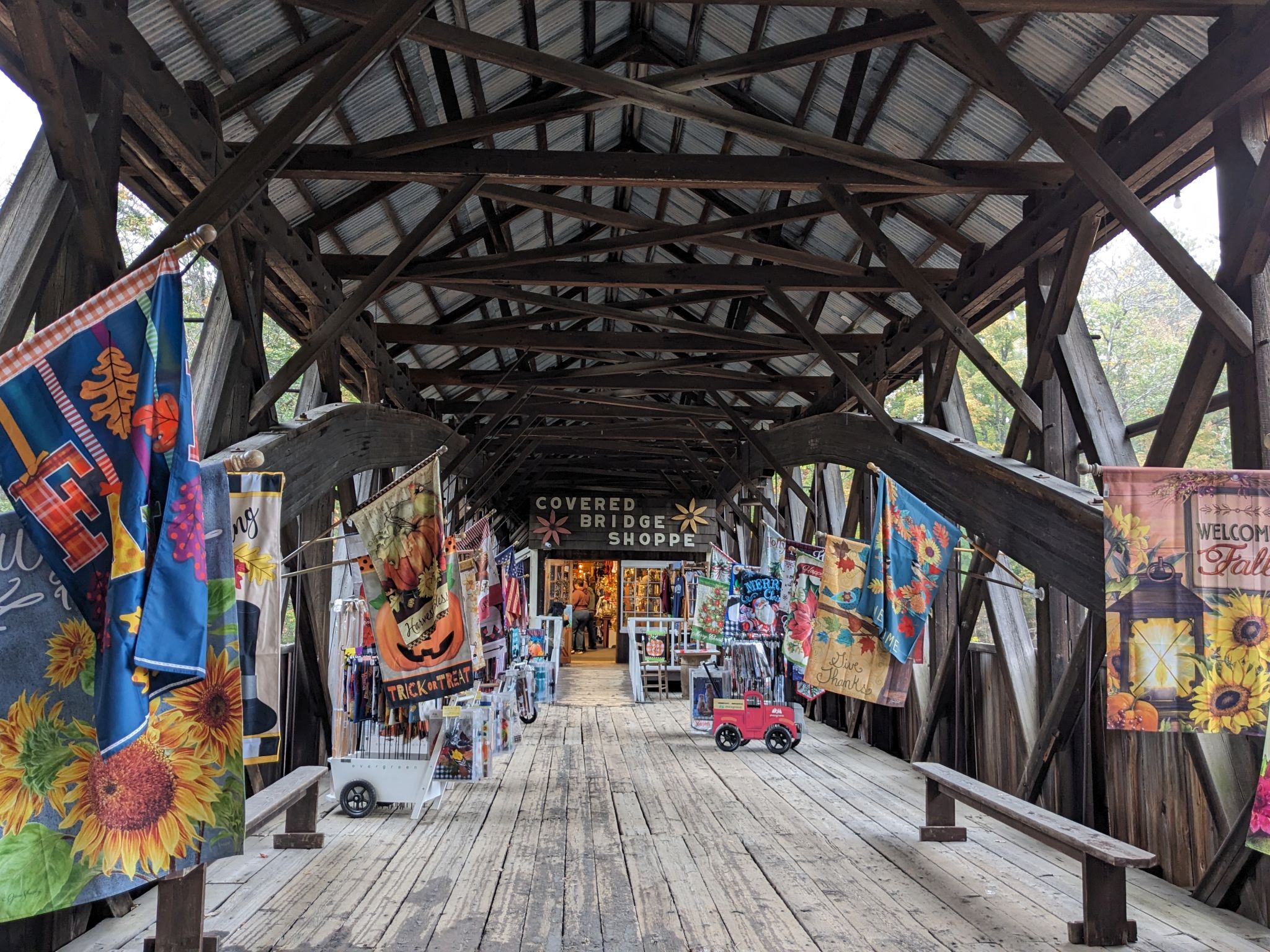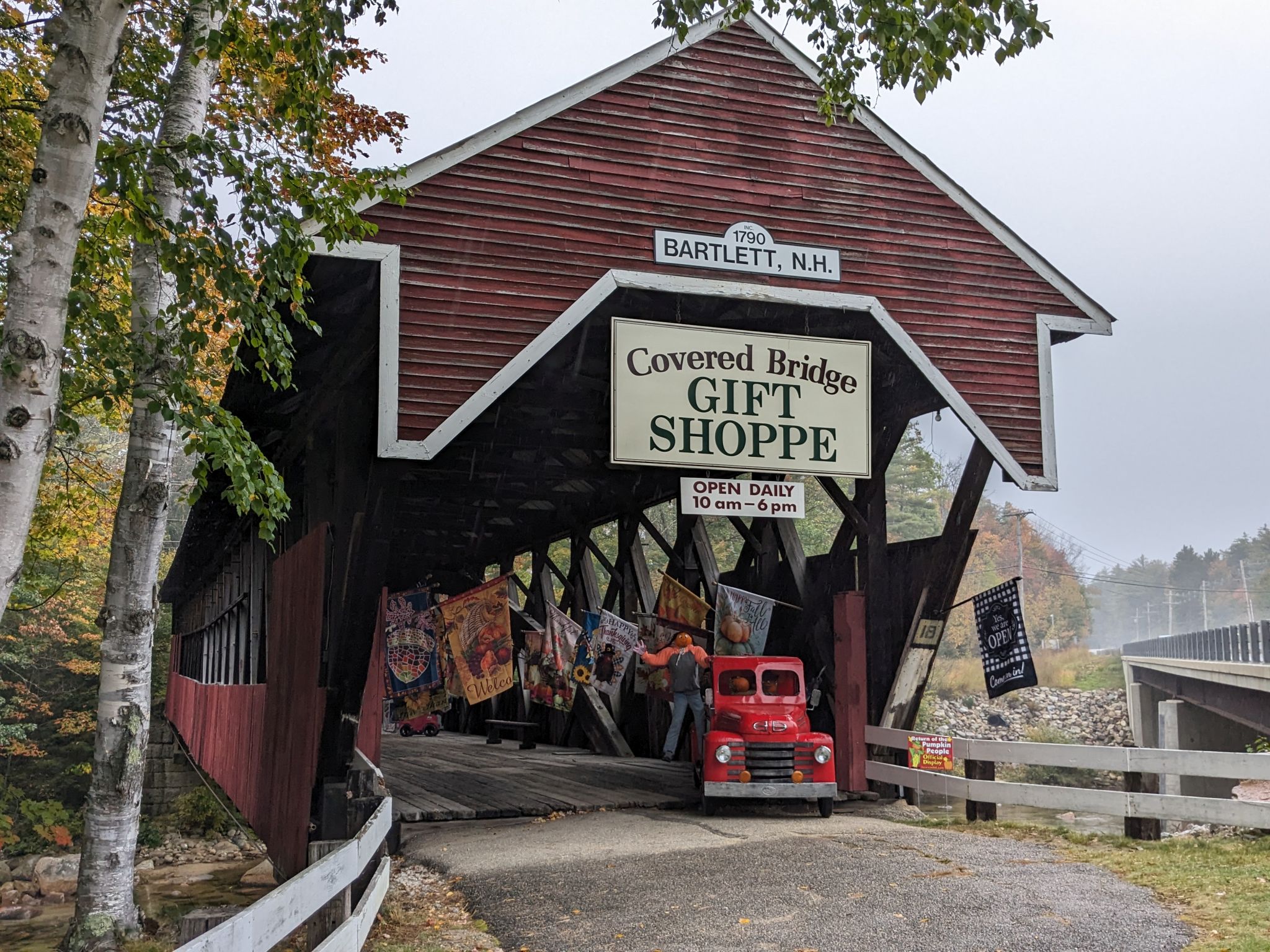 Nach der Tour ist das Wetter leider sehr schlecht. Auf der Rückfahrt beginnt es leicht zu regnen. Trotzdem haben wir noch 2 kurze Stopps vor uns. Zuerst ein Gift Shop in einer Covered Bridge. Der sieht nicht nur genial aus, er hat auch wirklich schöne Souvenirs aus den White Mountains.