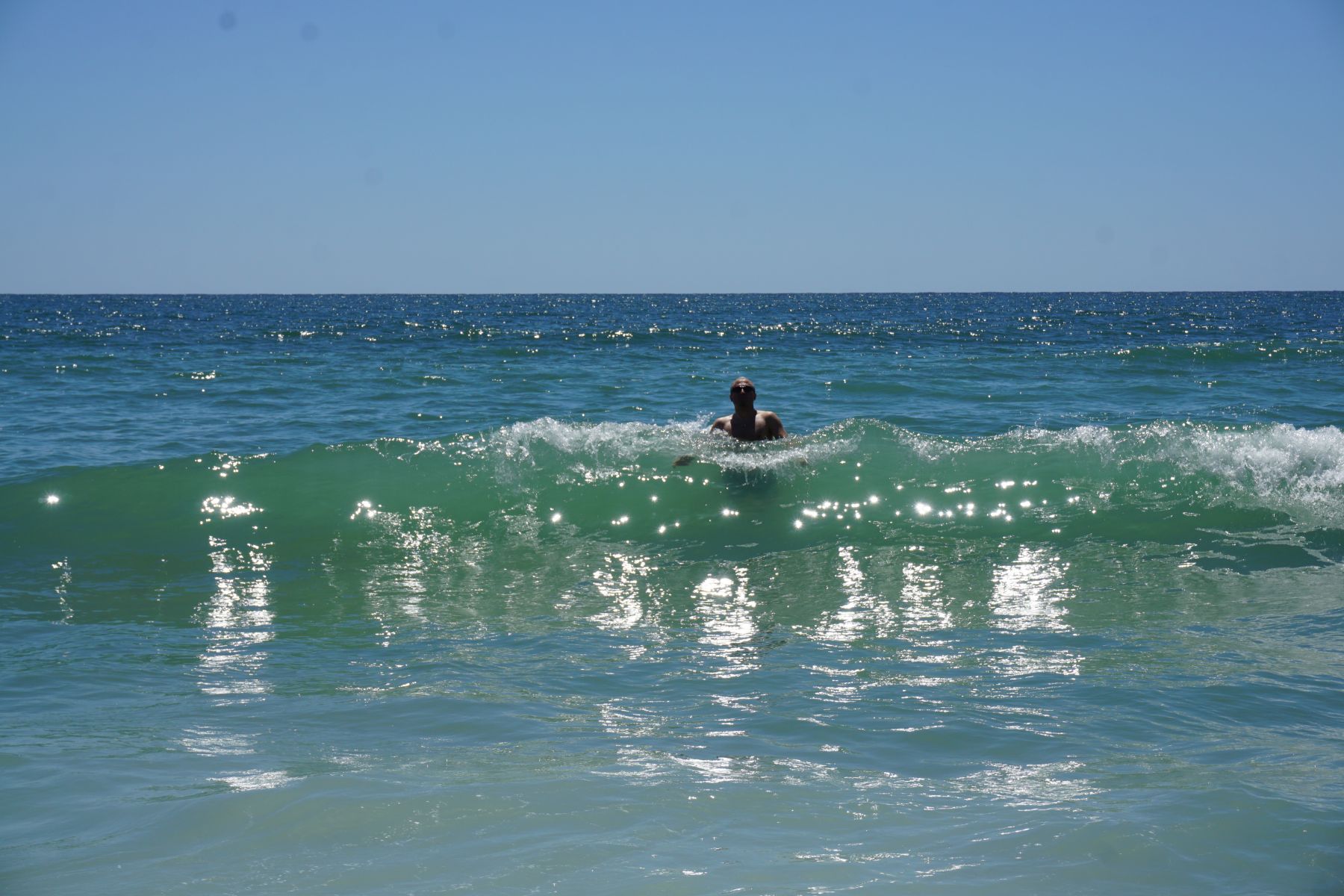 Danach geht es ab zum Strand. Es ist nicht zu heiß und es geht immer etwas Wind. Wir haben einige Wellen, sodass nur Martin wirklich weit hineingeht und gegen die Wellen kämpft.