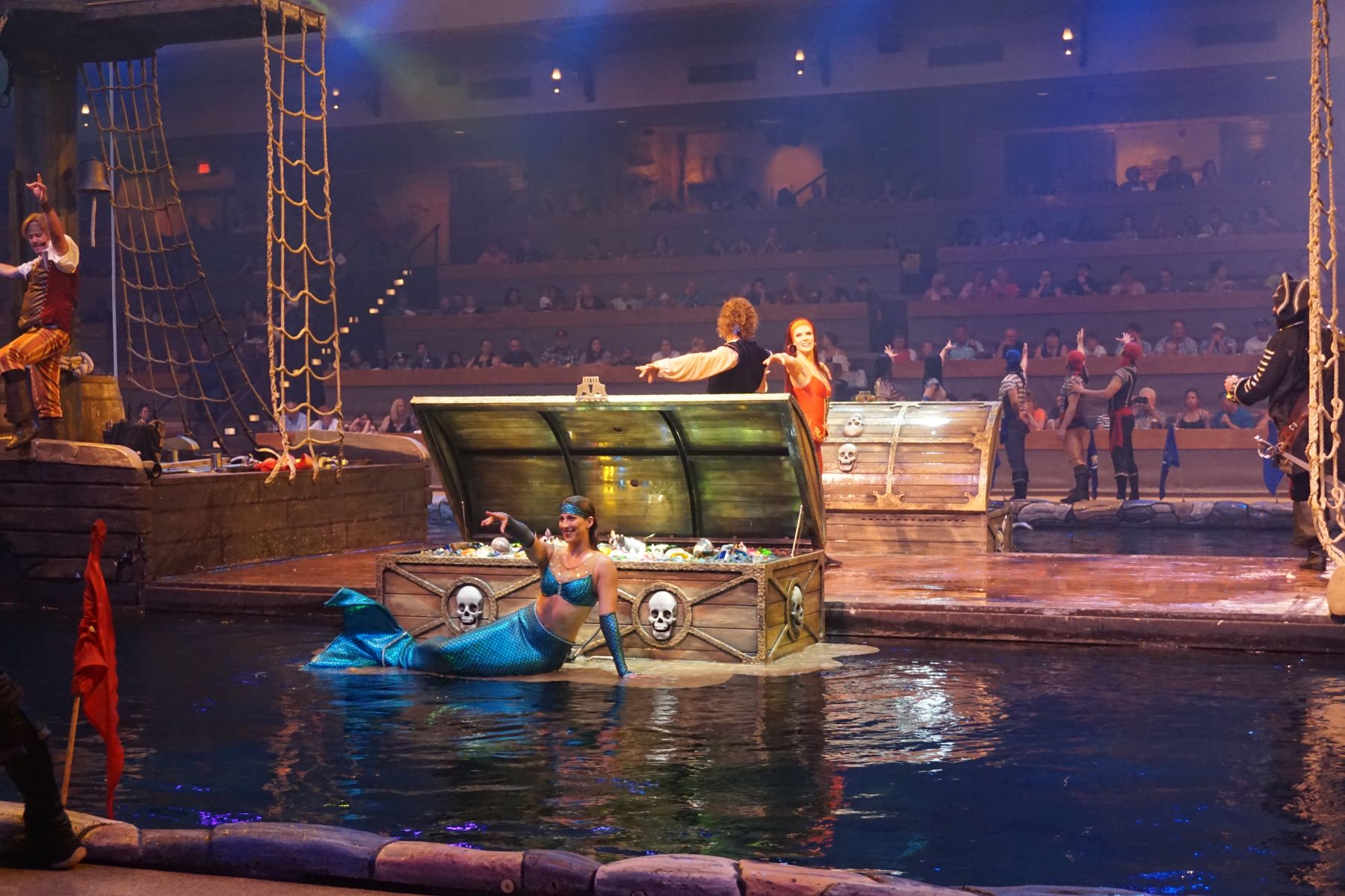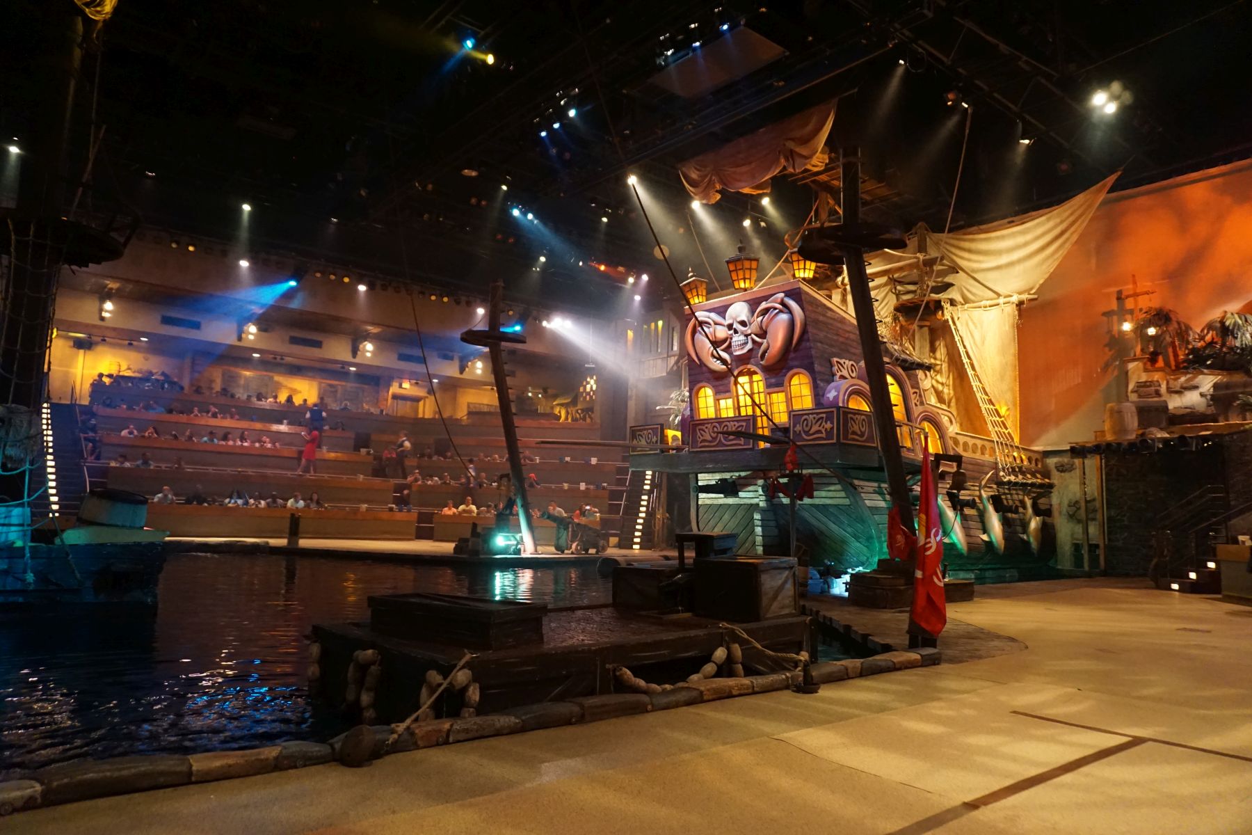 Schon bei der Kartenbuchung wurde man in rot (Crimson) und blau (Saphire) unterteilt. Das sind die beiden Piratenschiffe, die im Theater dann gegeneinander antreten und zu dessen Crew man gehört. Mitten im Theater ist ein Wasserbecken an deren Ränder die beiden Schiffe stehen. In der Mitte ist eine kleine Bühne.