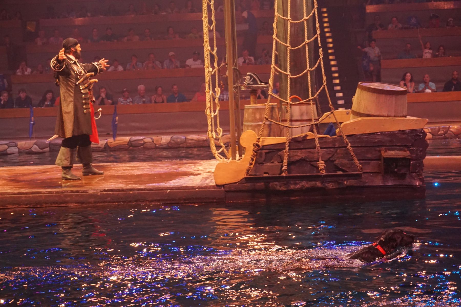 Schnell wird klar, dass hier viel Action angesagt ist. Die Piraten sind Akrobaten, die Bodenturnen, Trampolinspringen, Turm- (bzw. vom Mast) springen, an der Stange turnen und die Hauptdarsteller singen auch noch. Einige Meerjungfrauen sind auch zu sehen – schließlich geht es ja auch um eine Schatzsuche. Die beiden Piratencrews treten in einem Wettkampf gegeneinander an bei denen alles und jeder nass wird. Dabei sind auch Hunde, ein Walross und Seehunde beteiligt.