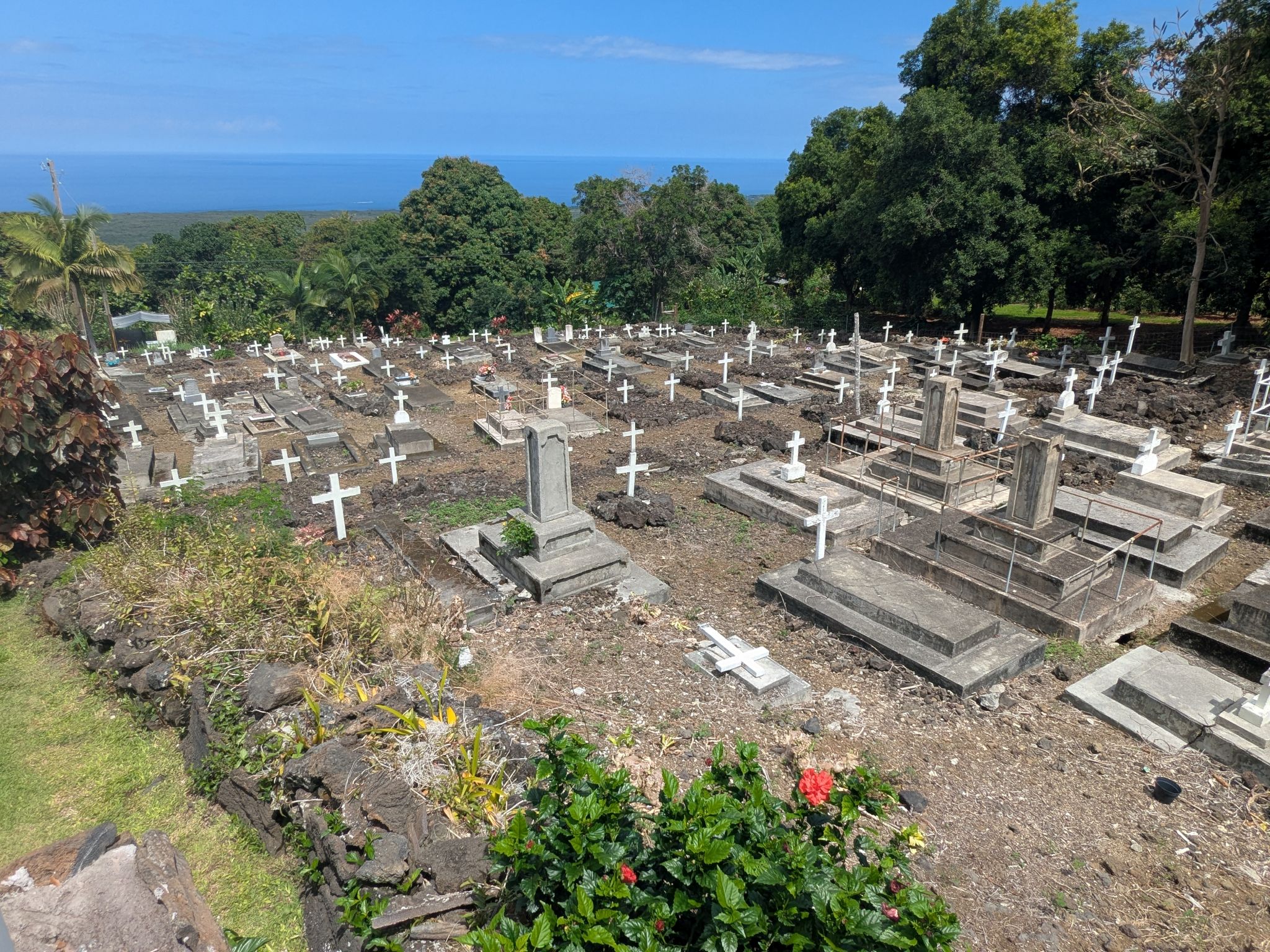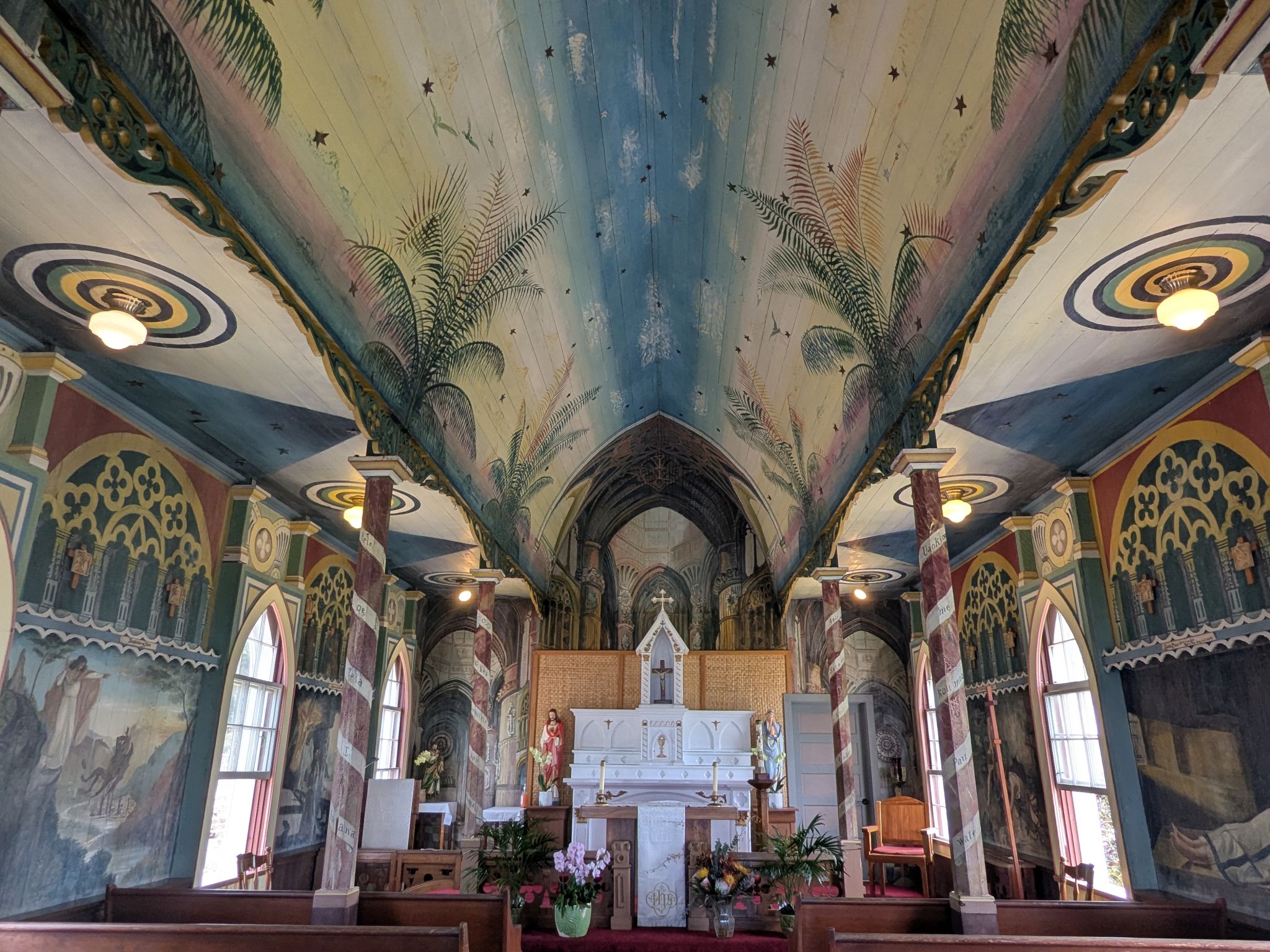 Die heutige Kirche wurde 1899 von dem belgischen Missionar Pater John Velghe errichtet. Ohne jegliche Berufsausbildung und mit Hausfarbe auf gewöhnlichem Holz verschönerte er die Kirche mit seinen Gemälden. Damals konnten nur wenige Hawaiianer lesen, daher lehrte er mit Bildern – mit großem Erfolg. Er benötigte für alle Gemälde insgesamt vier Jahre. Hinter dem Altar ist eine spanische Kirche und an den Wänden sind sechs Bibelszenen abgebildet. Dazu kommt ein wunderschöner Sternenhimmel mit den Säulen als Palmen. Viele kleine Details sind in den Kunstwerken versteckt. Wir staunen während uns ein netter Mann die Geschichte der Kirche erzählt.