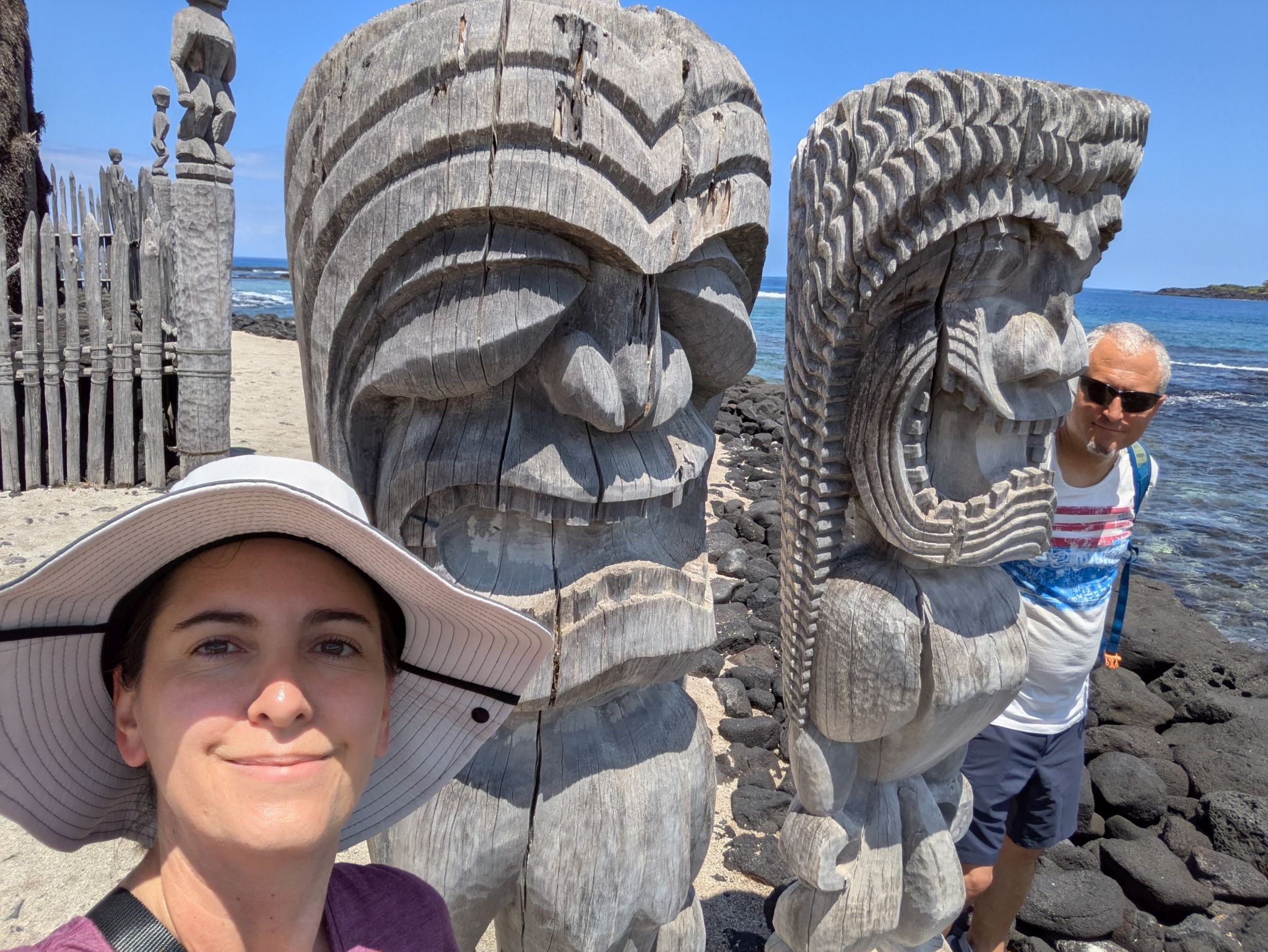 Wir erkunden den Park und sehen die Häuser in den Royal Grounds, die Great Wall, eine 3 m hohe und 5 m breite Mauer, kämpferische Kiis (hölzerne Götterbildnisse), die den Hale o Keawe Heiau bewachen, einen heiligen Tempel, der die Gebeine von 23 alii (Stammeshäuptlingen) beherbergt.
