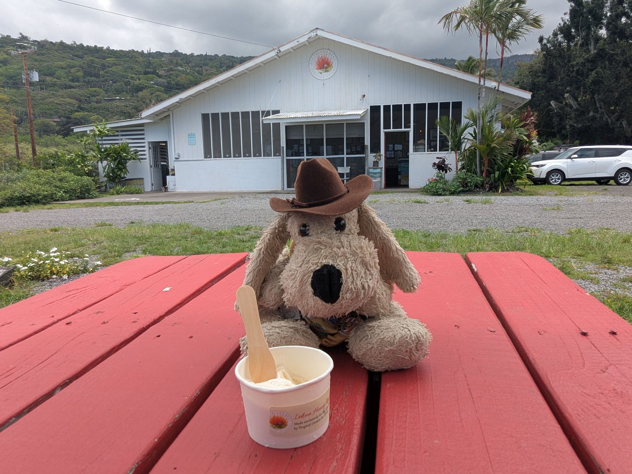Vom leckeren Macadamia Nut Blossom Honey haben wir bereits ein kleines Glas verdrückt, davon besorgen wir also Nachschub. Außerdem schmeckt uns bei der Verkostung der Wilelaiki Honey von der Christmasberry, den wir auch gleich mitnehmen. Außerdem gibt es hier ein Honig-Eis, das Hundn gleich verkosten muss.