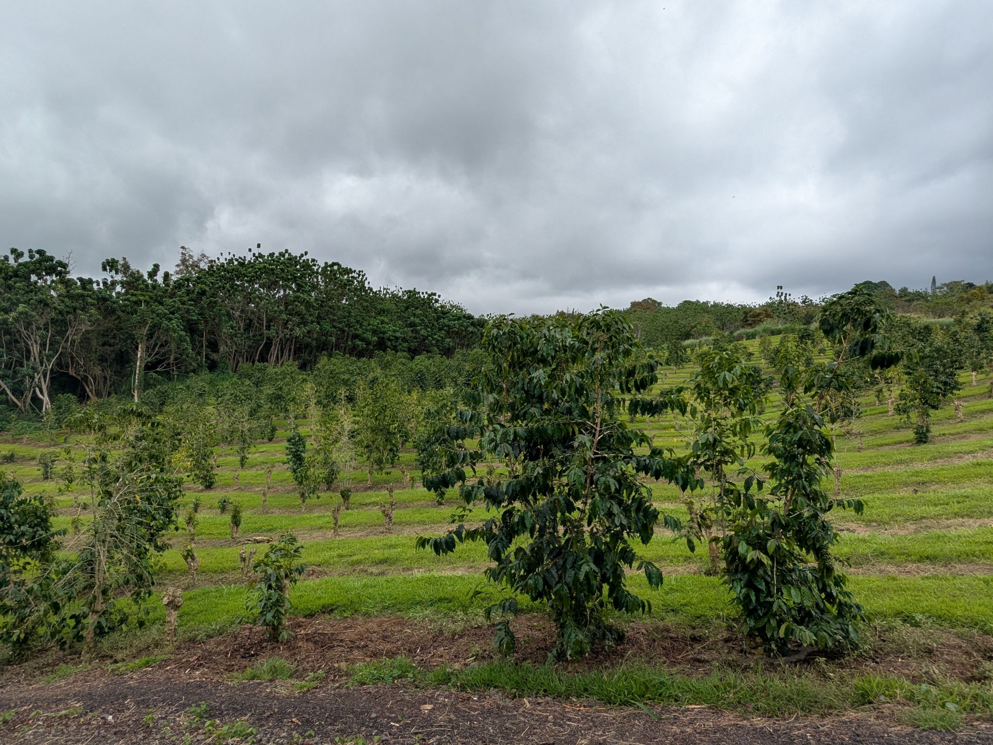 Wir befinden uns hier im Coffee Belt von Hawaii – nur hier wächst der Kaffee aufgrund der perfekten klimatischen Bedingungen. Kaffeepflanzen sind sehr eigen. Sie benötigen einiges an Sonnenschein, einiges an Schatten und täglich einen Regenguss, nach dem man die Uhr stellen kann.