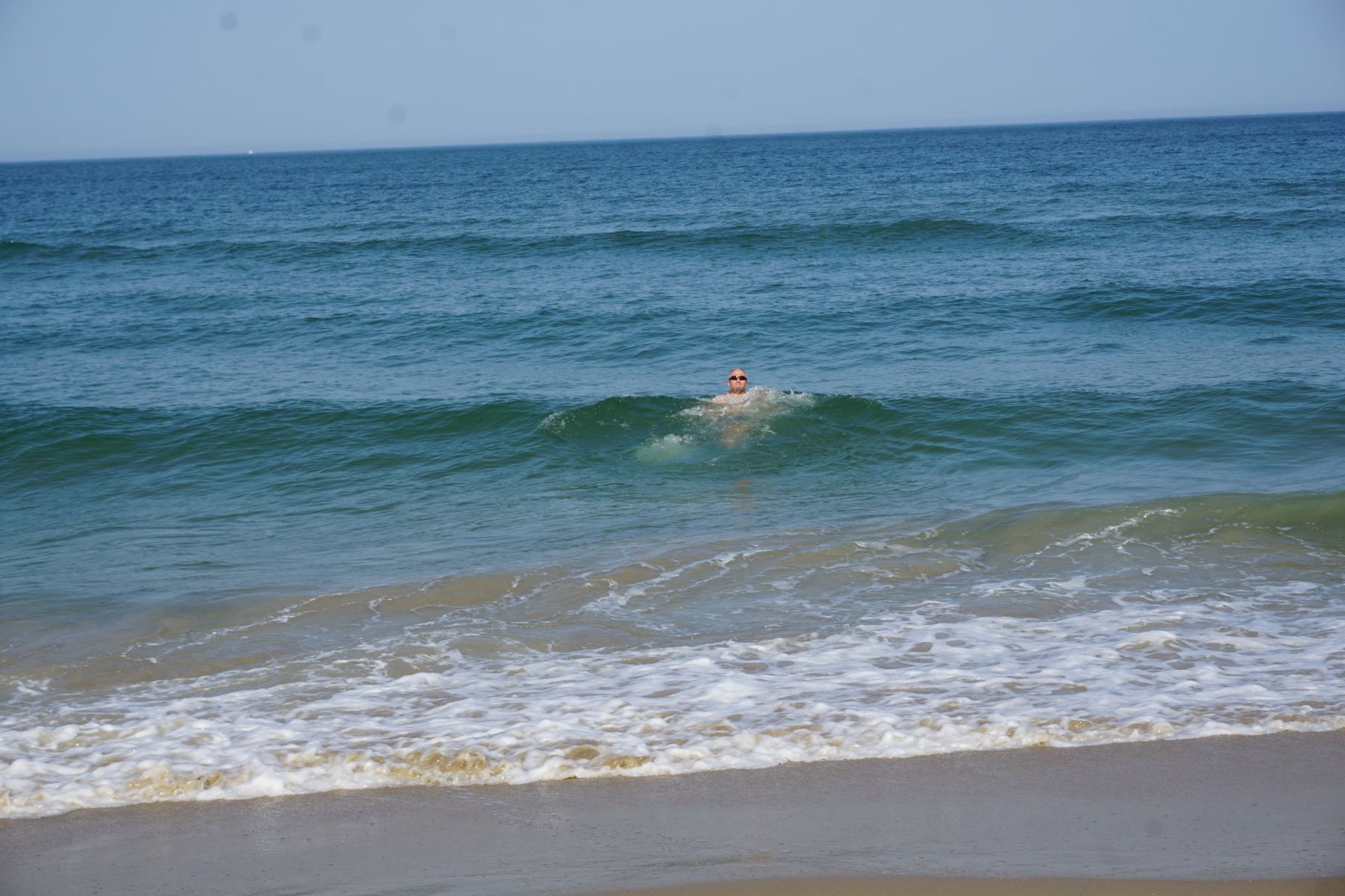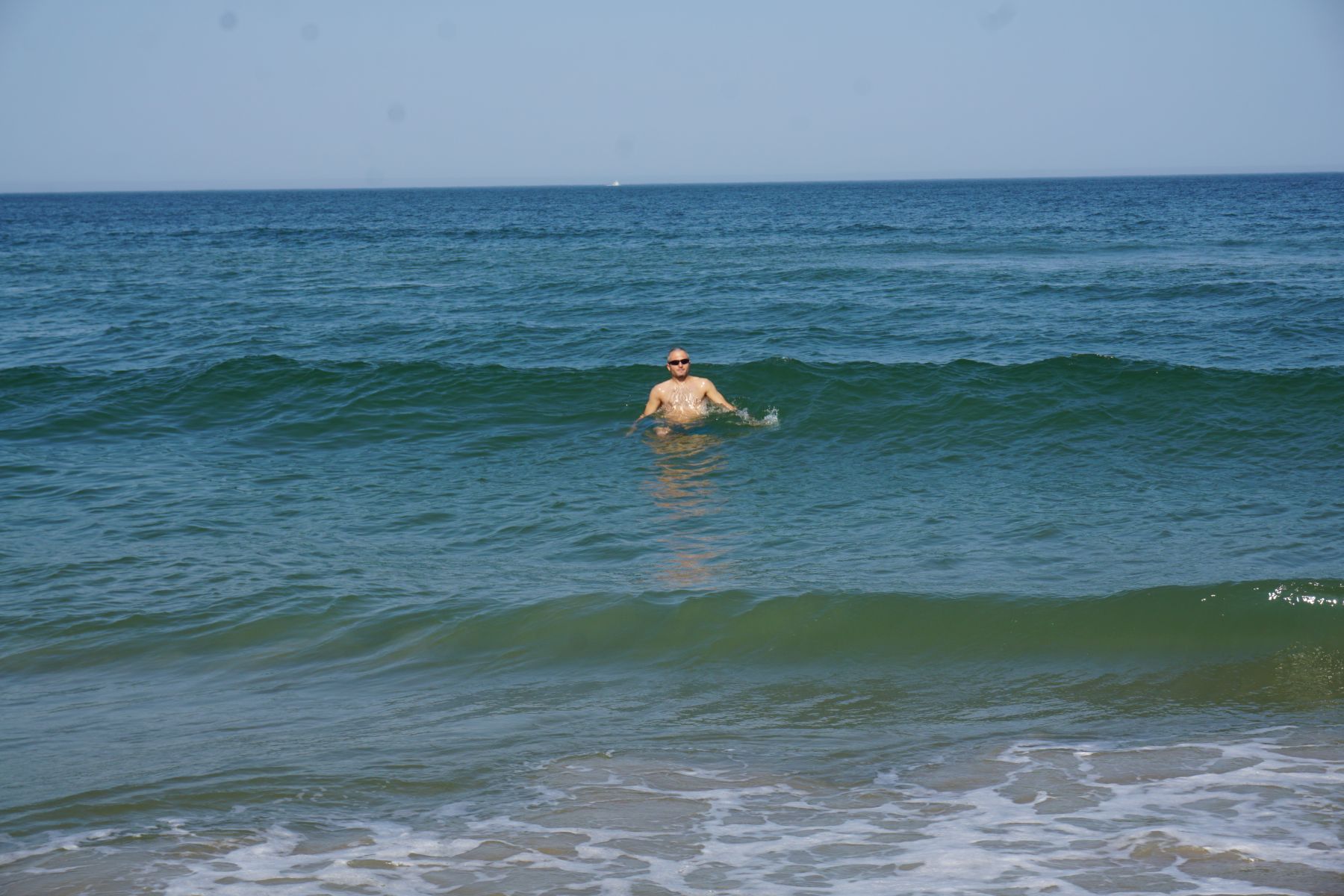 Etwas später gehen wir noch zum Strand und Martin wirft sich mutig in die kalten Wellen.
