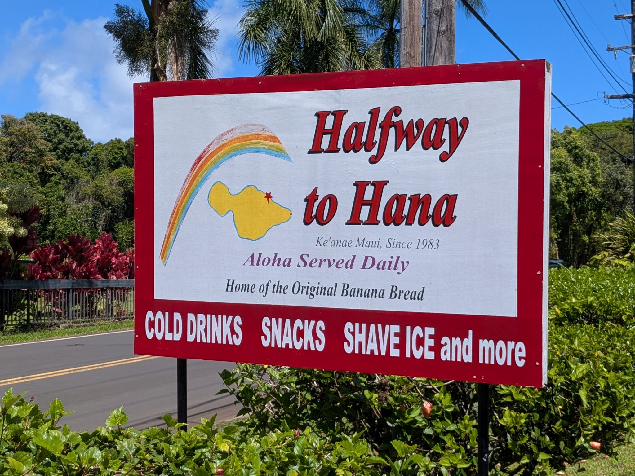 Nun erreichen wir den Punkt Halfway to Hana, wo wir uns so alle Touristen Bananenbrot besorgen. Es schmeckt ausgezeichnet und hat einen leichten Zimtgeschmack. Das müssen wir zu Hause dann auch gleich ausprobieren.