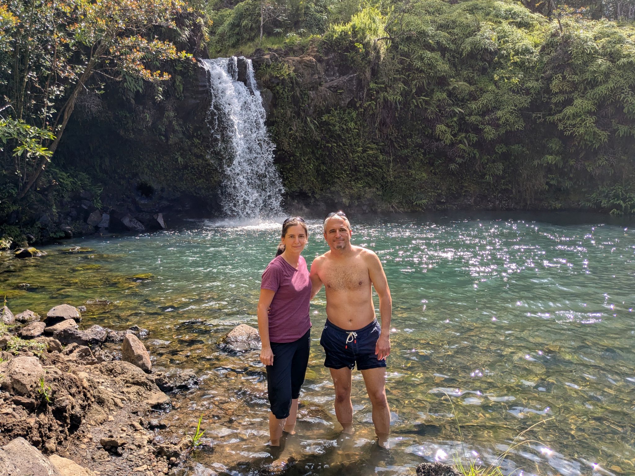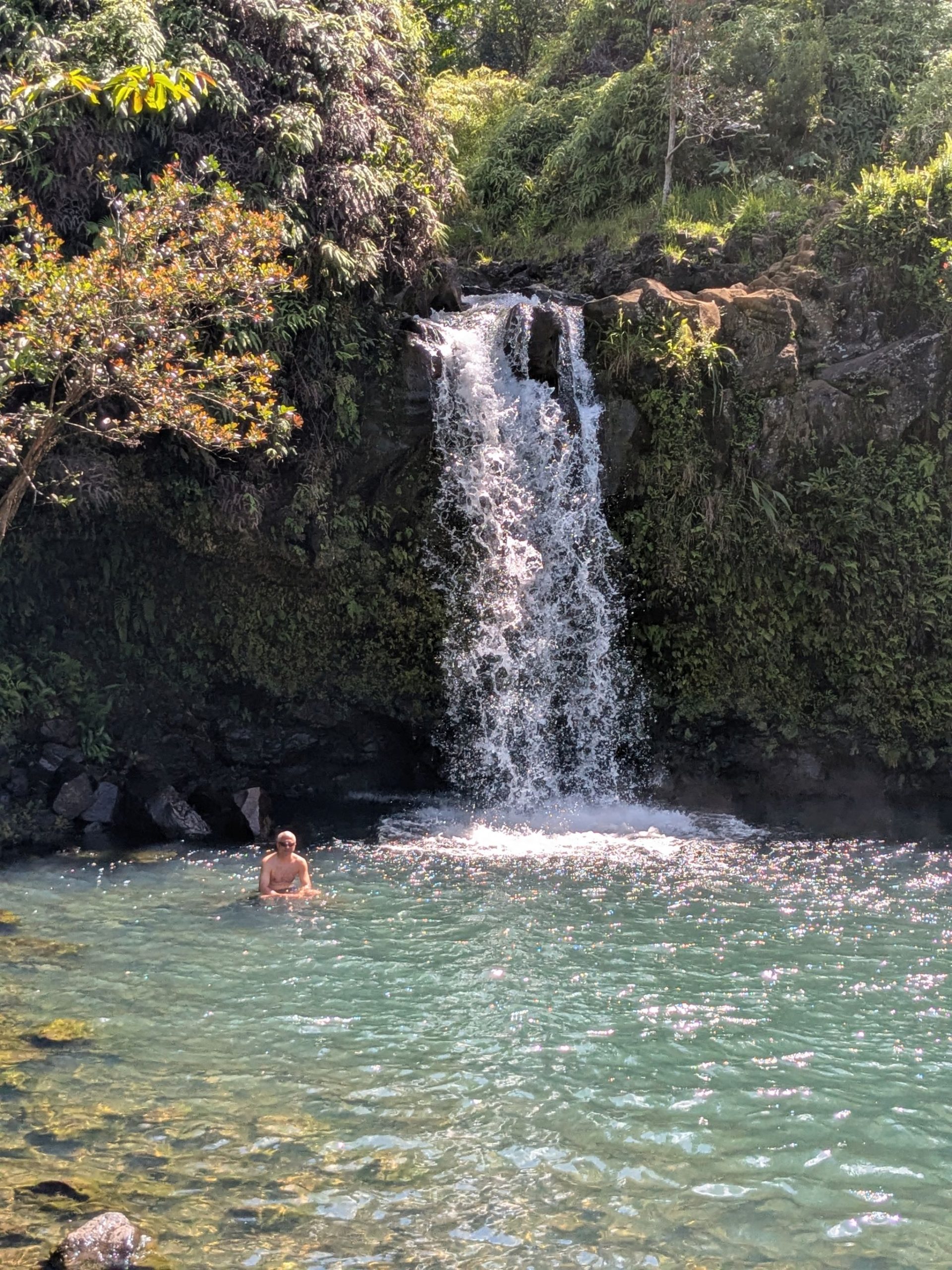 Den ersten kleinen Wasserfall sehen wir hier auch schon! Die Puohokamoa Falls liegen in einem wunderschönen Panorama und fallen 9 m in einen Pool.