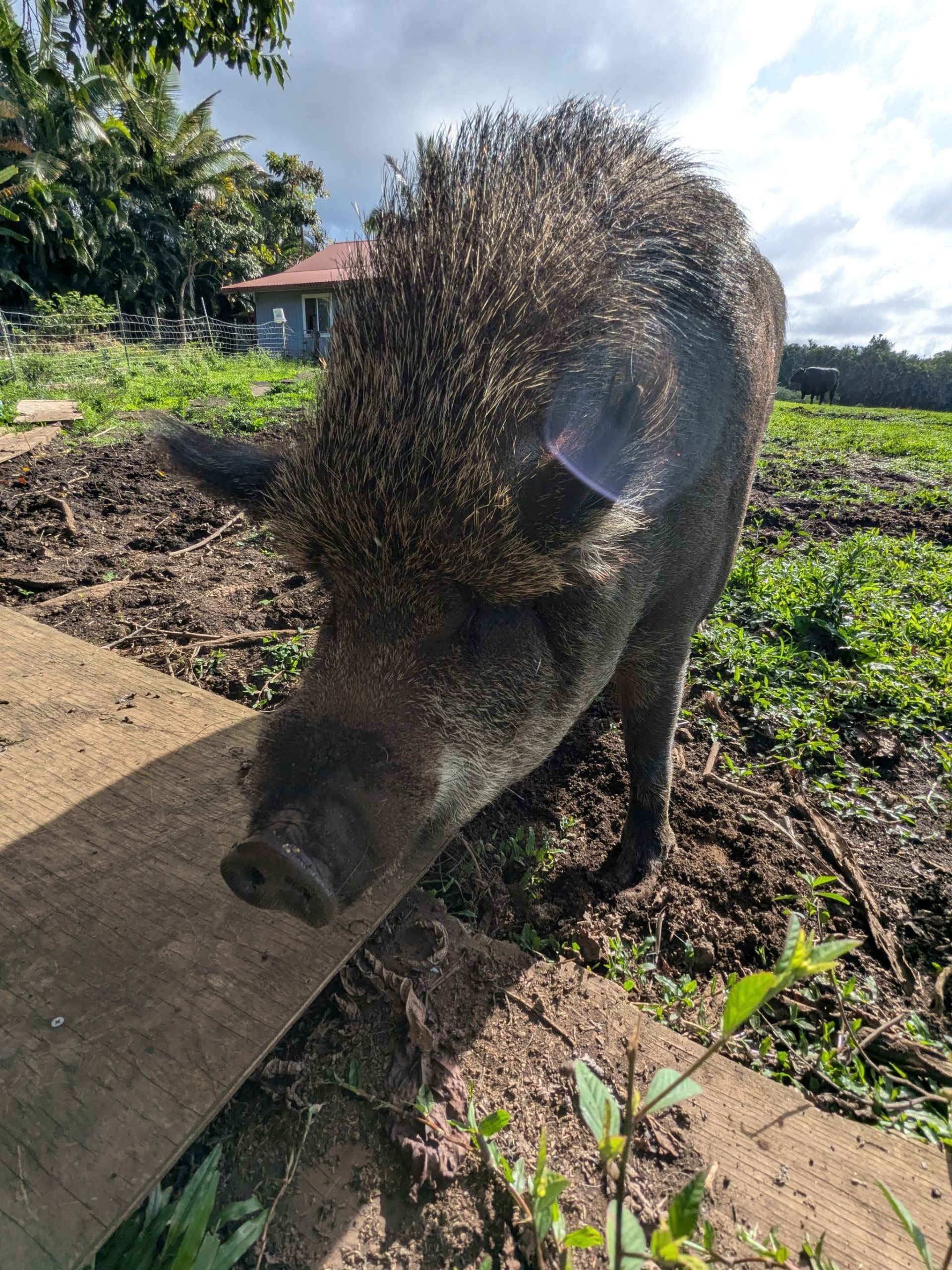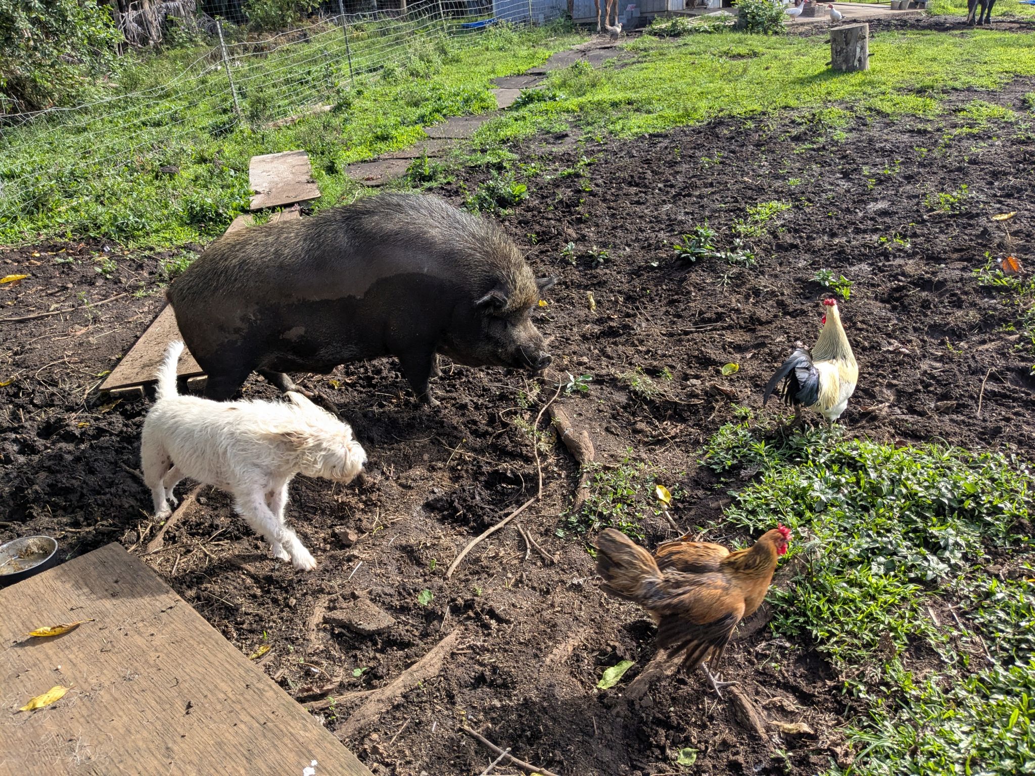 Jetzt ist es nicht mehr weit bis zu unserer ganz besonderen Unterkunft: JJ’s Hana Hale ist ein Gnadenhof für vernachlässigte Tiere. Die Besitzer Alan & Sharon zeigen uns sofort alles und stellen uns die ersten Tiere vor. Es gibt Pferde, Hühner, Ziegen, Black Angus Rinder und die beiden Hunde Lucy & Bear – die beiden werden wir noch seeeeehr oft streicheln müssen.