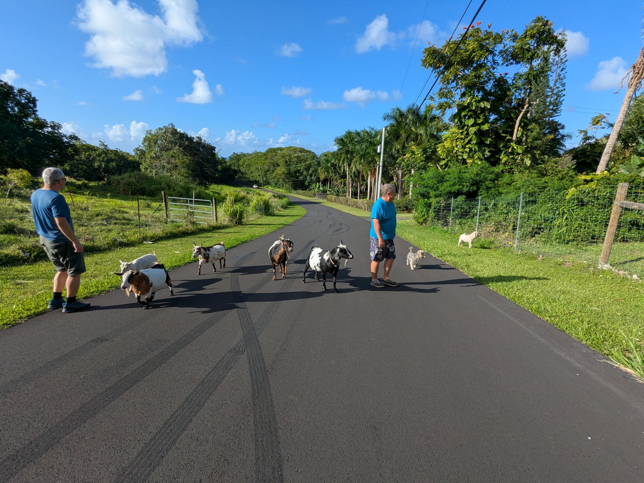 Wir packen kurz etwas aus und gehen dann mit Alan, den Ziegen und den beiden Hunden eine kleine Runde spazieren.