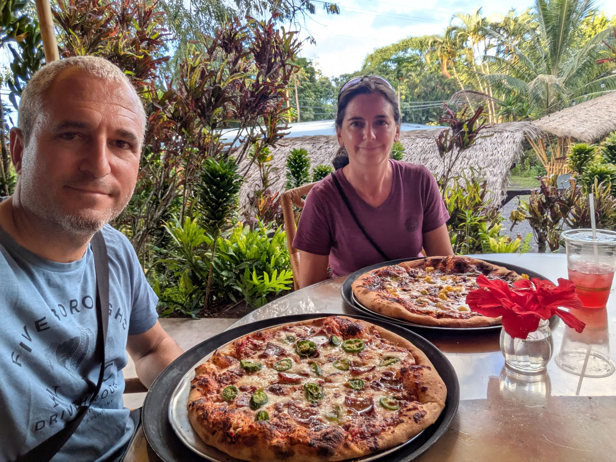 Nachdem wir schon ordentlich Hunger haben, empfiehlt uns Sharon die Hāna Farms Roadside Stand, Pizza Oven and Bakery. Dort fahren wir hin und genießen wirklich eine sehr gute Pizza. Dazu gibt es Hibiskus-Soda. Und die Portion reicht auch noch für morgen Mittag.