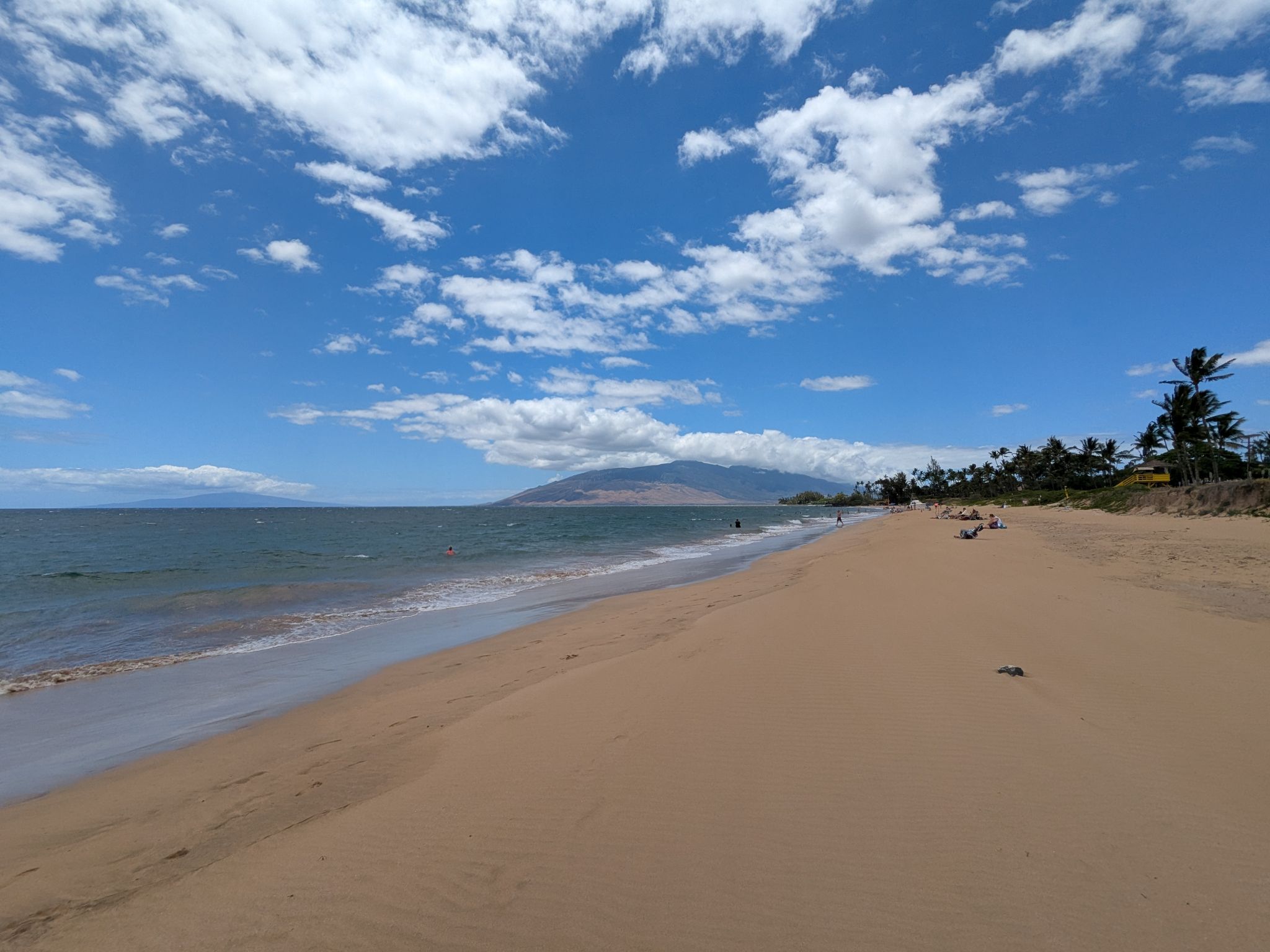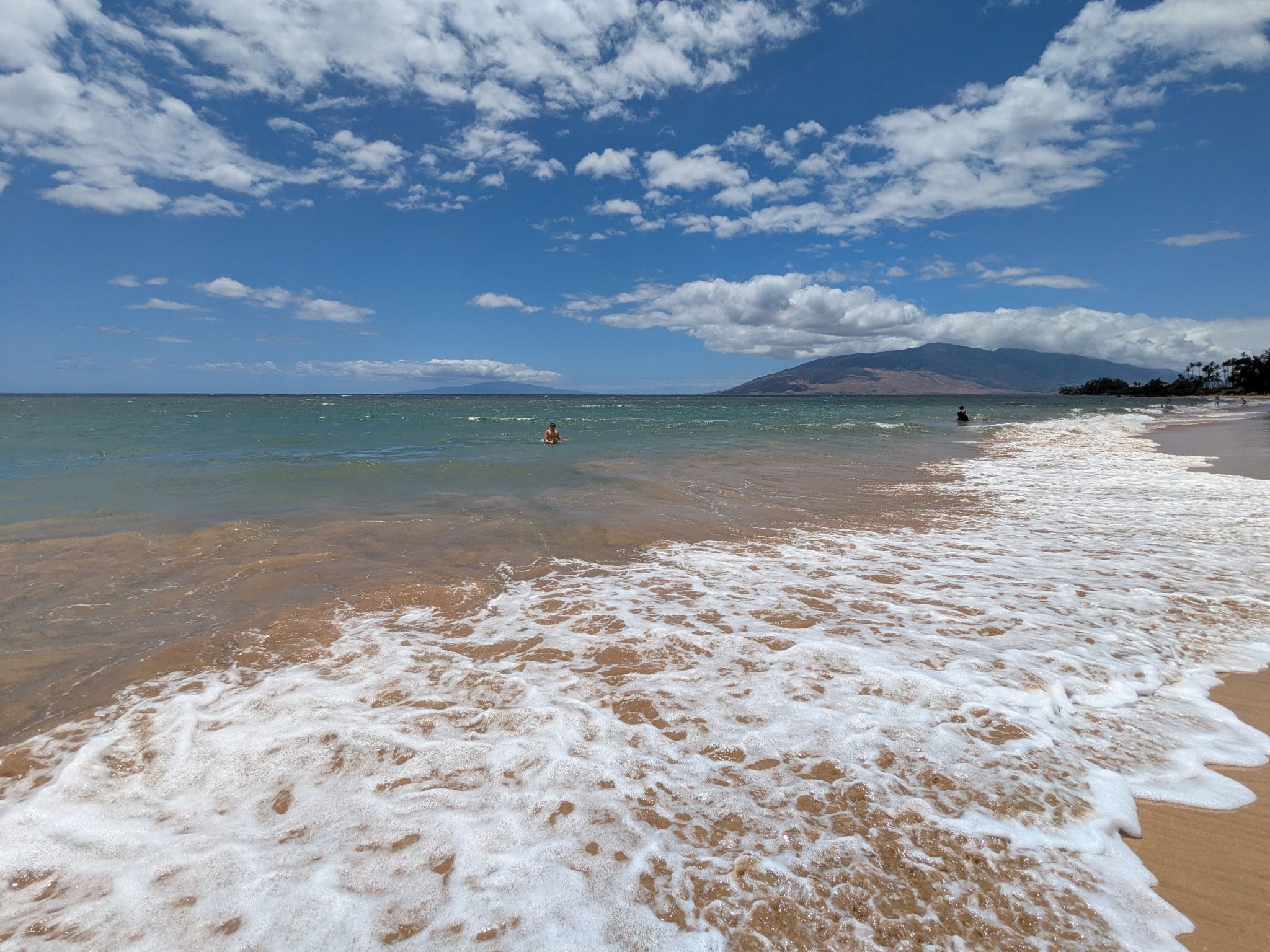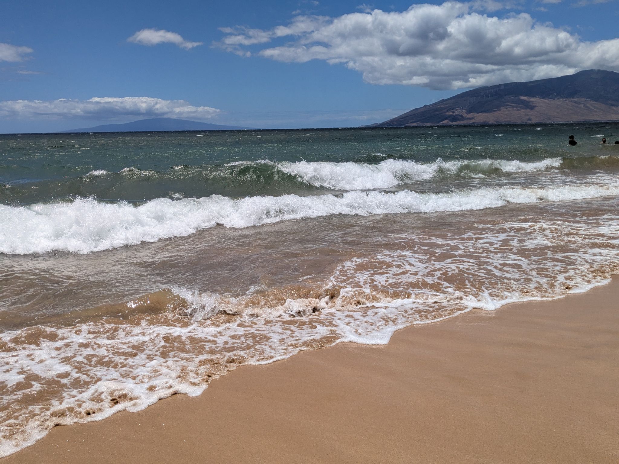 Um die Mittagszeit herum packen wir unsere Badesachen und gehen zum Strand, der sich fast direkt gegenüber unserer Anlage befindet. Der Kamaole Beach Park I hat sehr feinen Sand und mit dem heutigen starken Wind doch einige Wellen. Ein Lifeguard ist zur Sicherheit auch hier.